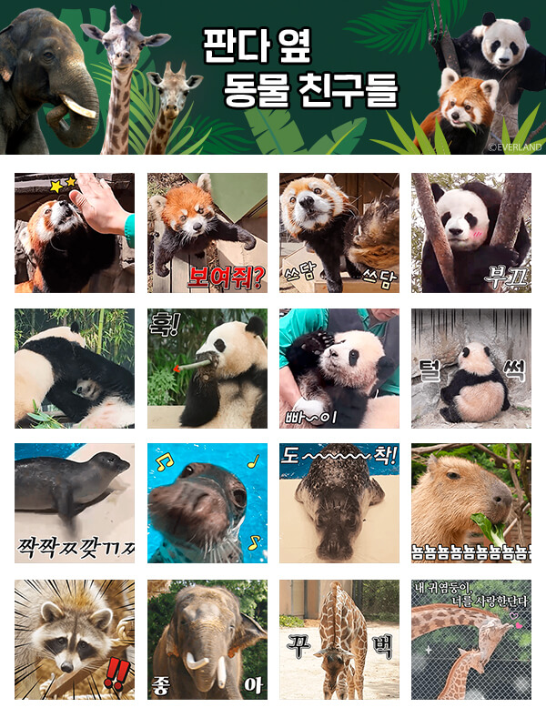 이번에 출시된 '판다 옆 동물 친구들' 이모티콘은 에버랜드, 뿌빠TV 등 유튜브 채널에 올라온 다양한 동물 영상 중 팬들에게 많은 사랑을 받은 명장면에 재치있는 표현들을 가미해 총 24종으로 구성했다.