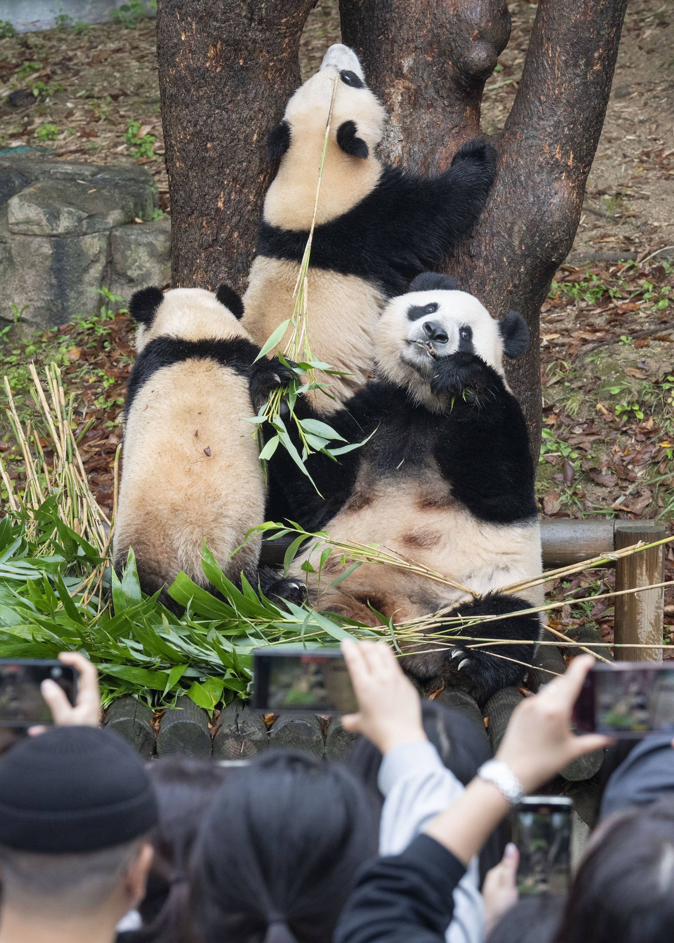 야외 방사장으로 나온 루이바오와 후이바오는 낙엽 위에 눕기도 하고, 나무타기 경쟁을 하며 서로 장난치기도 하는 등 엄마 아이바오와 함께 가을 나들이를 한껏 즐기는 모습을 보여줬다.