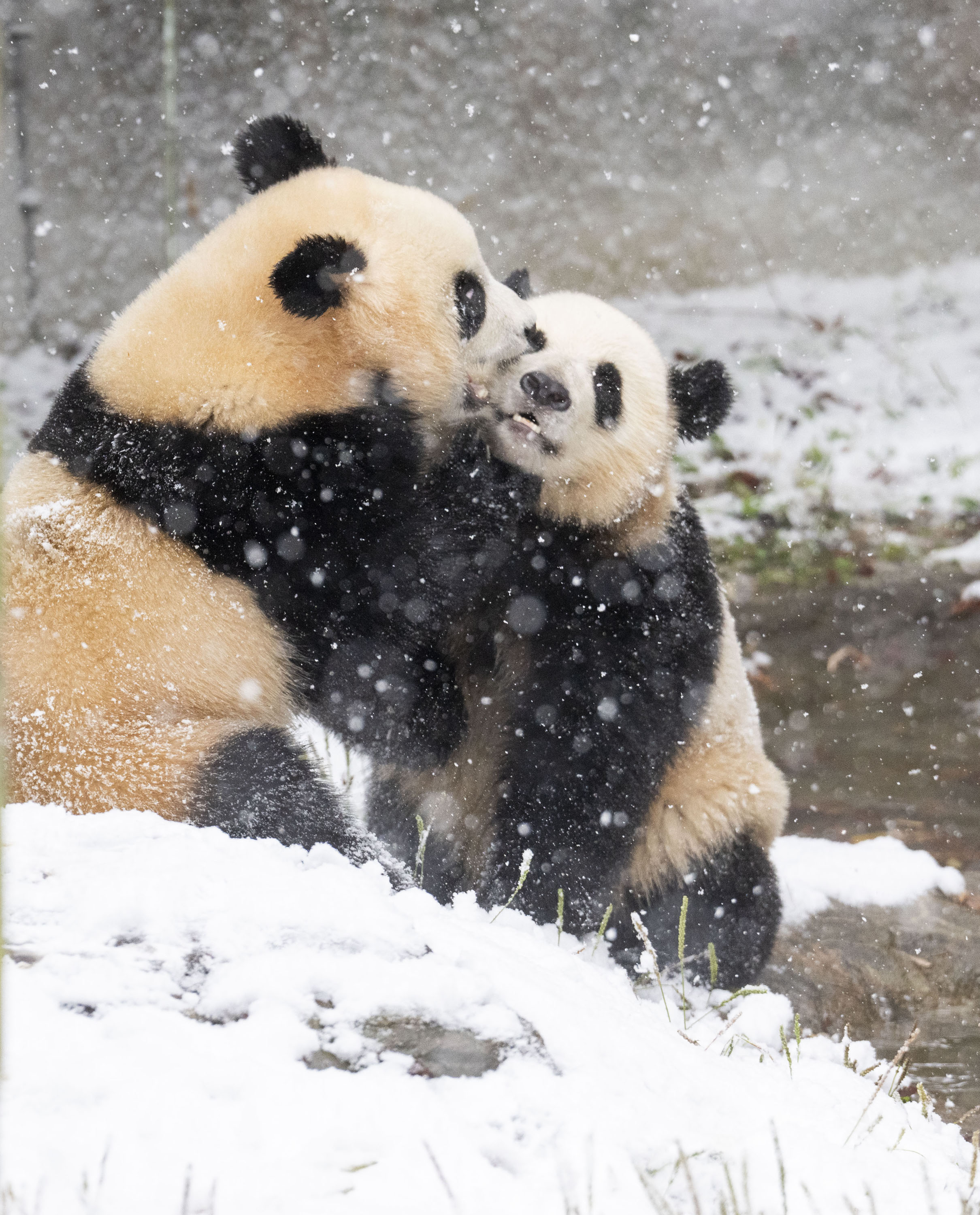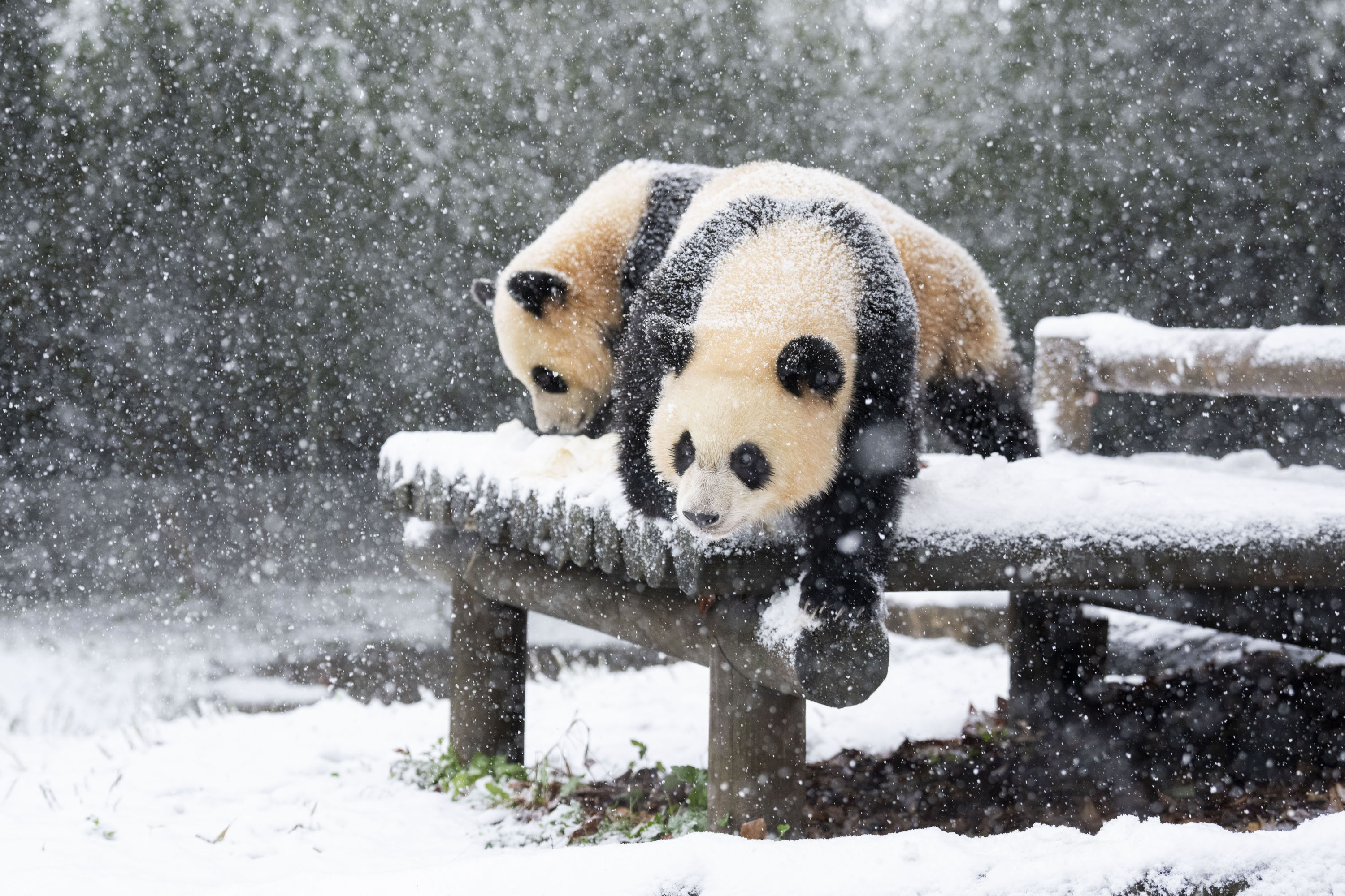 작년 7월 7일 태어난 쌍둥이 아기 판다들은 지난 겨울에는 너무 어려 실내 방사장에서 생활해 눈을 접할 수가 없었다.