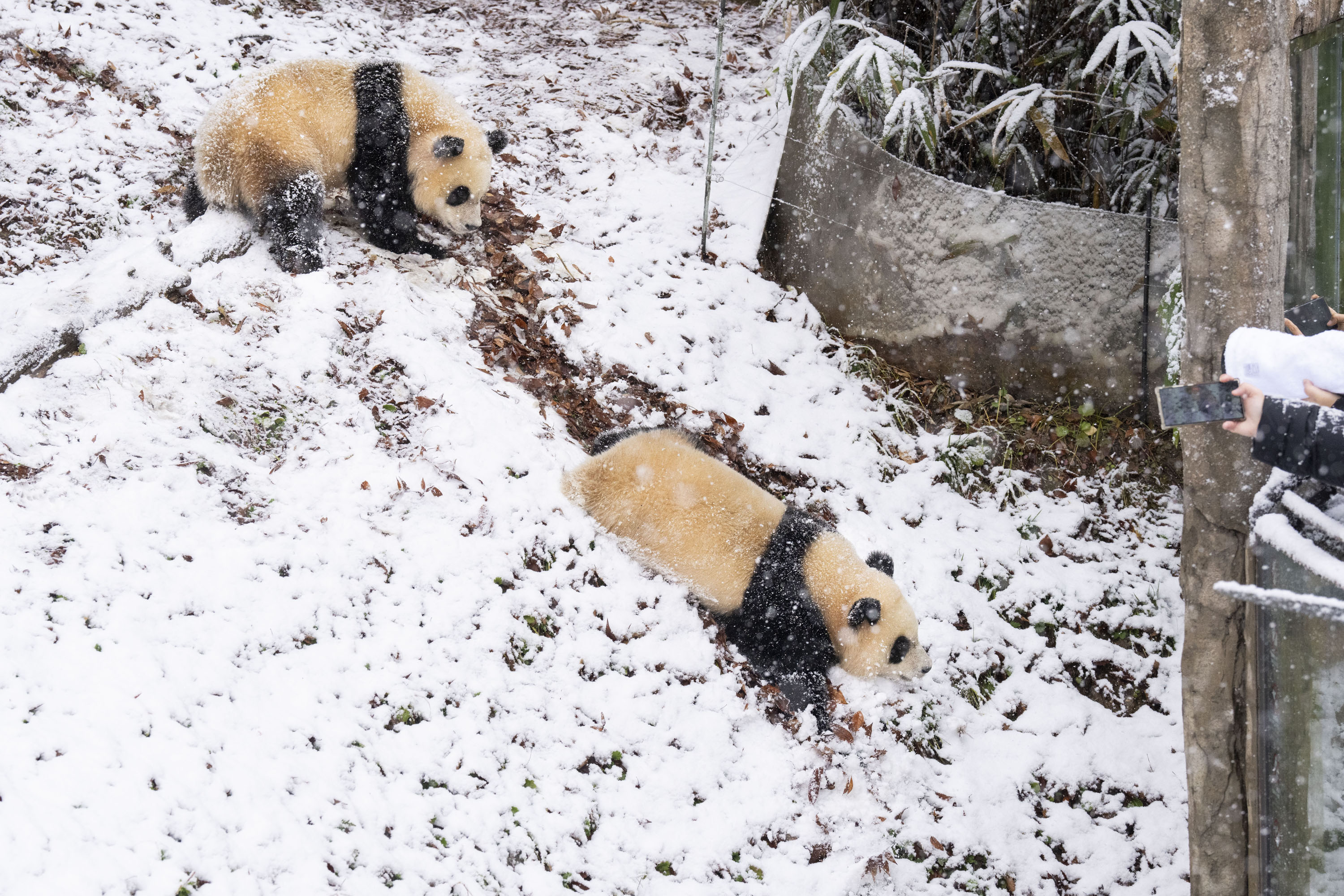 이날 밤사이 많은 눈이 내리자 판다 주키퍼들은 눈을 좋아하는 습성을 가진 판다들을 위해 루이바오와 후이바오가 난생 처음 눈에서 놀 수 있는 시간을 선물했다.