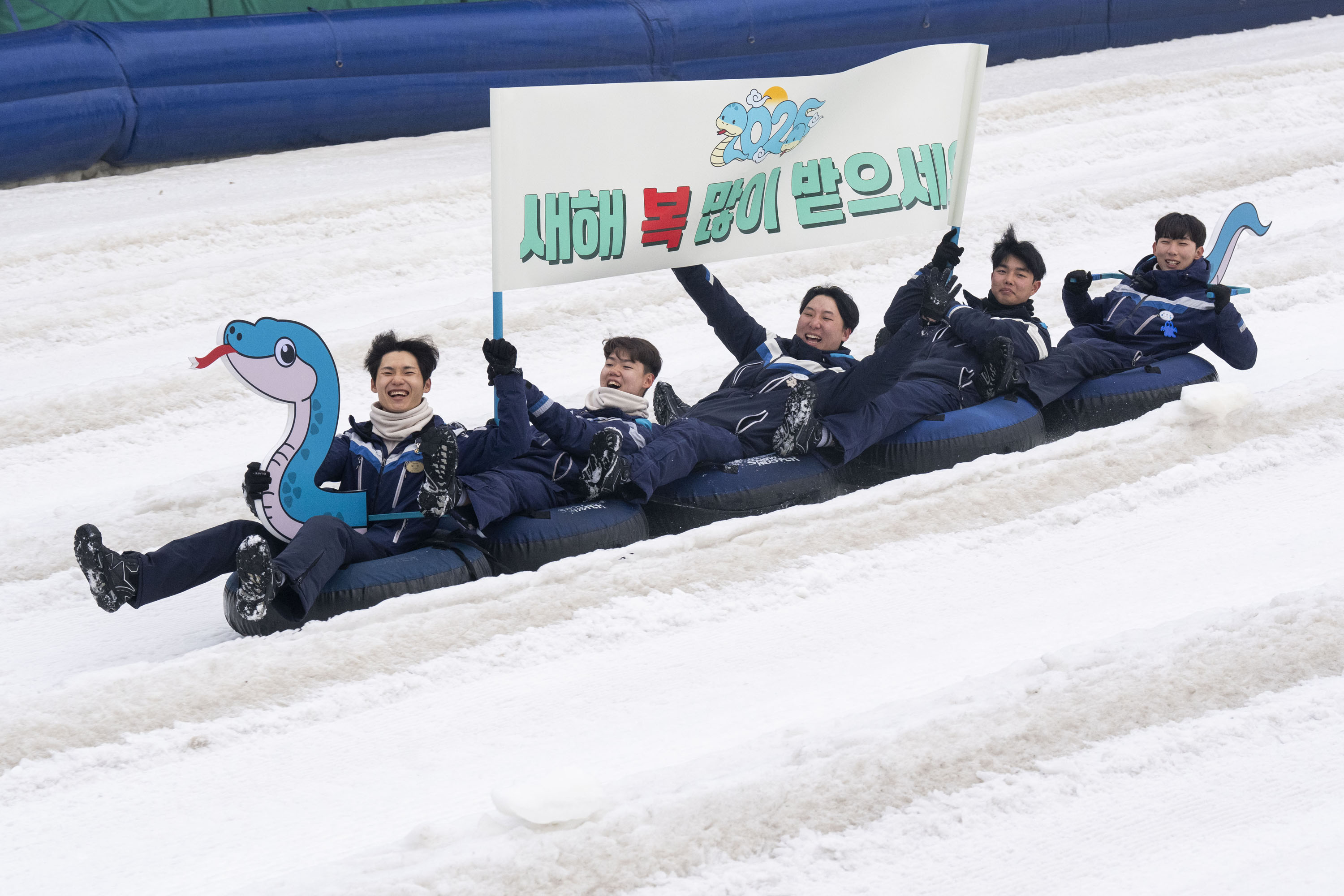 이번 주말부터 시작하는 설날 연휴를 사흘 앞둔 22일, 에버랜드 눈썰매장 스노우 버스터에서 직원들이 을사년(乙巳年) 푸른 뱀의 해를 맞아 푸른 뱀 모양으로 특별히 연출된 눈썰매를 타고 내려오며 '새해 복 많이 받으세요'가 적힌 깃발을 흔들고 있다.