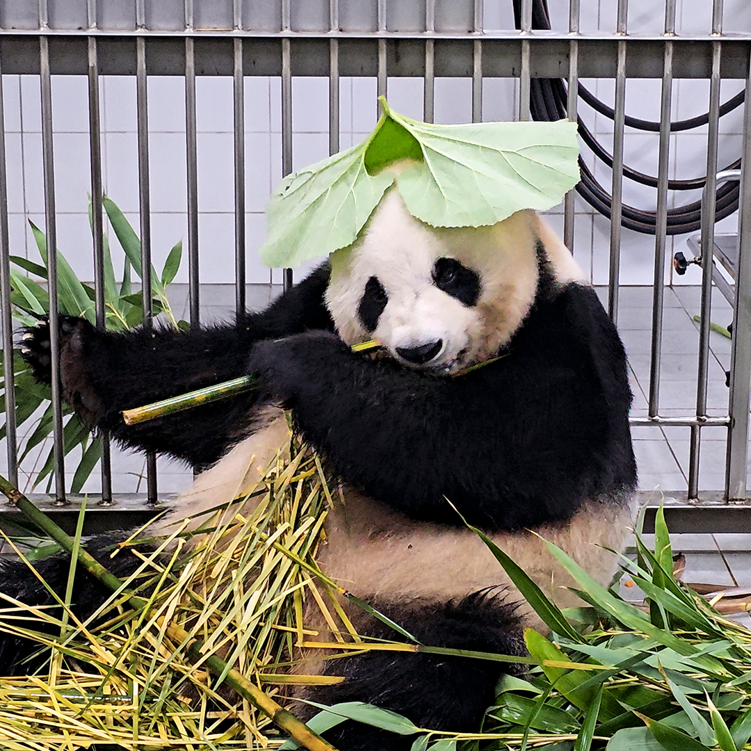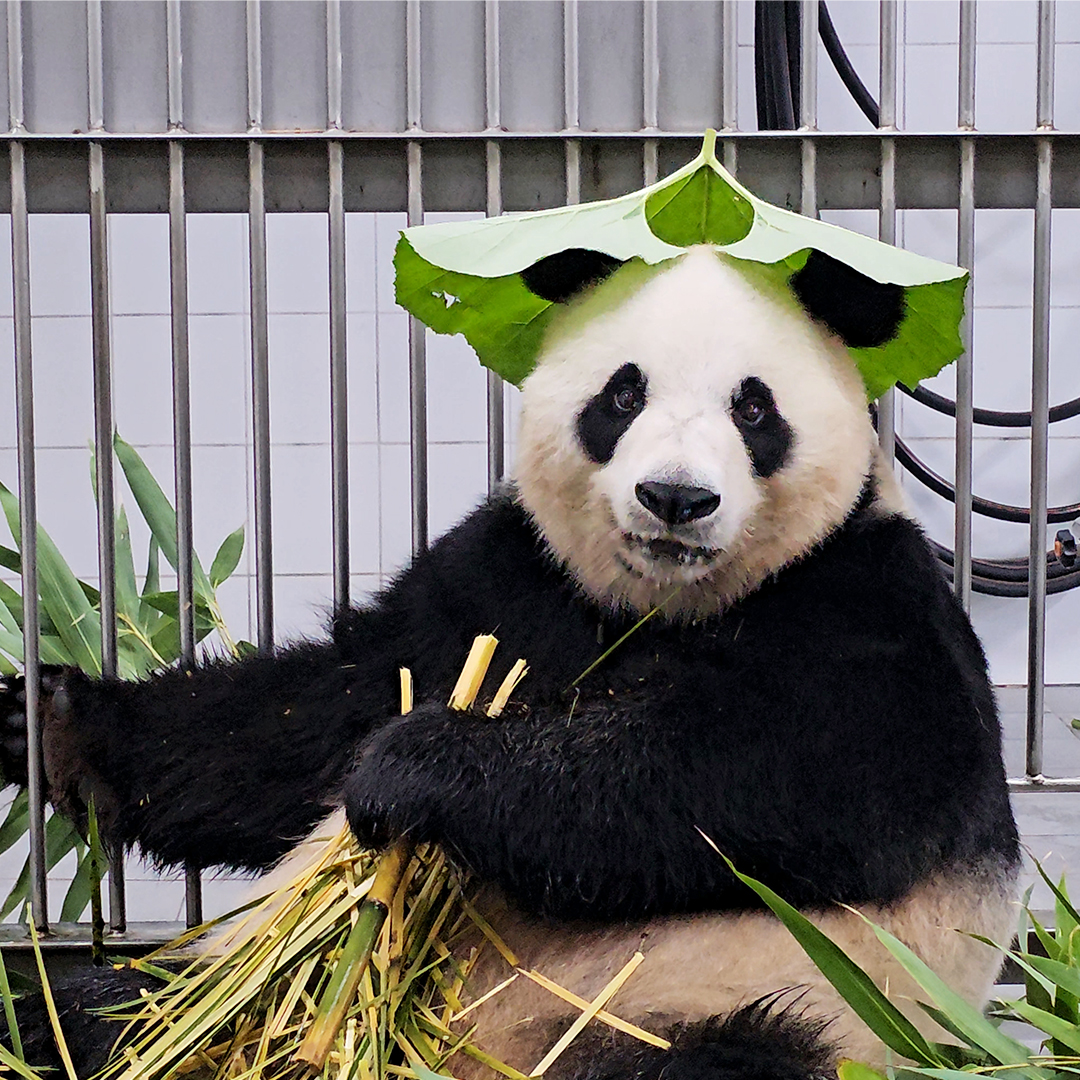 송바오에게 왕 큰 풀잎 모자 선물받고