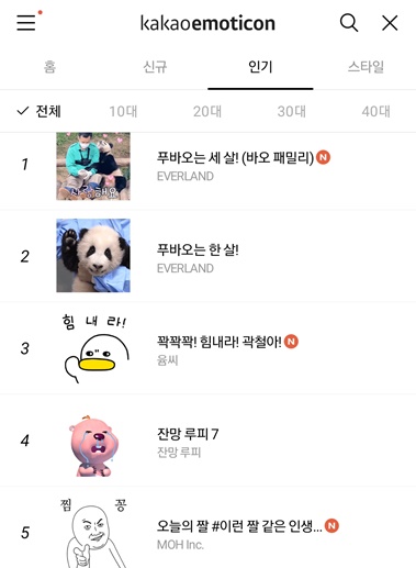 6일 오전 10시30분 공개된 푸바오 이모티콘 2탄은 하루만에 인기 순위 1위에 등극했으며, 10대부터 40대 이상까지 모든 연령대에서 1위를 기록하며 대세 이모티콘으로 등극했다.