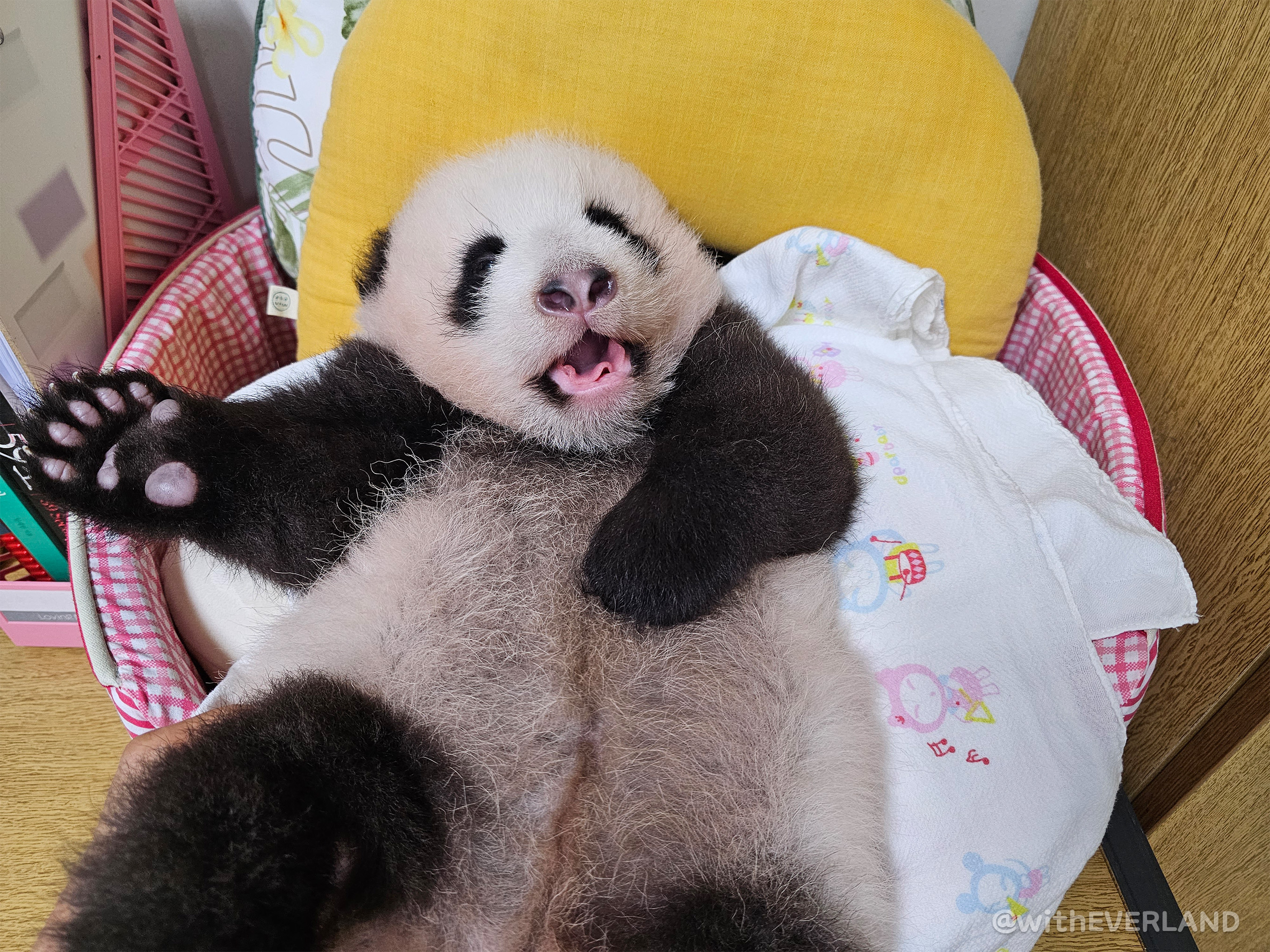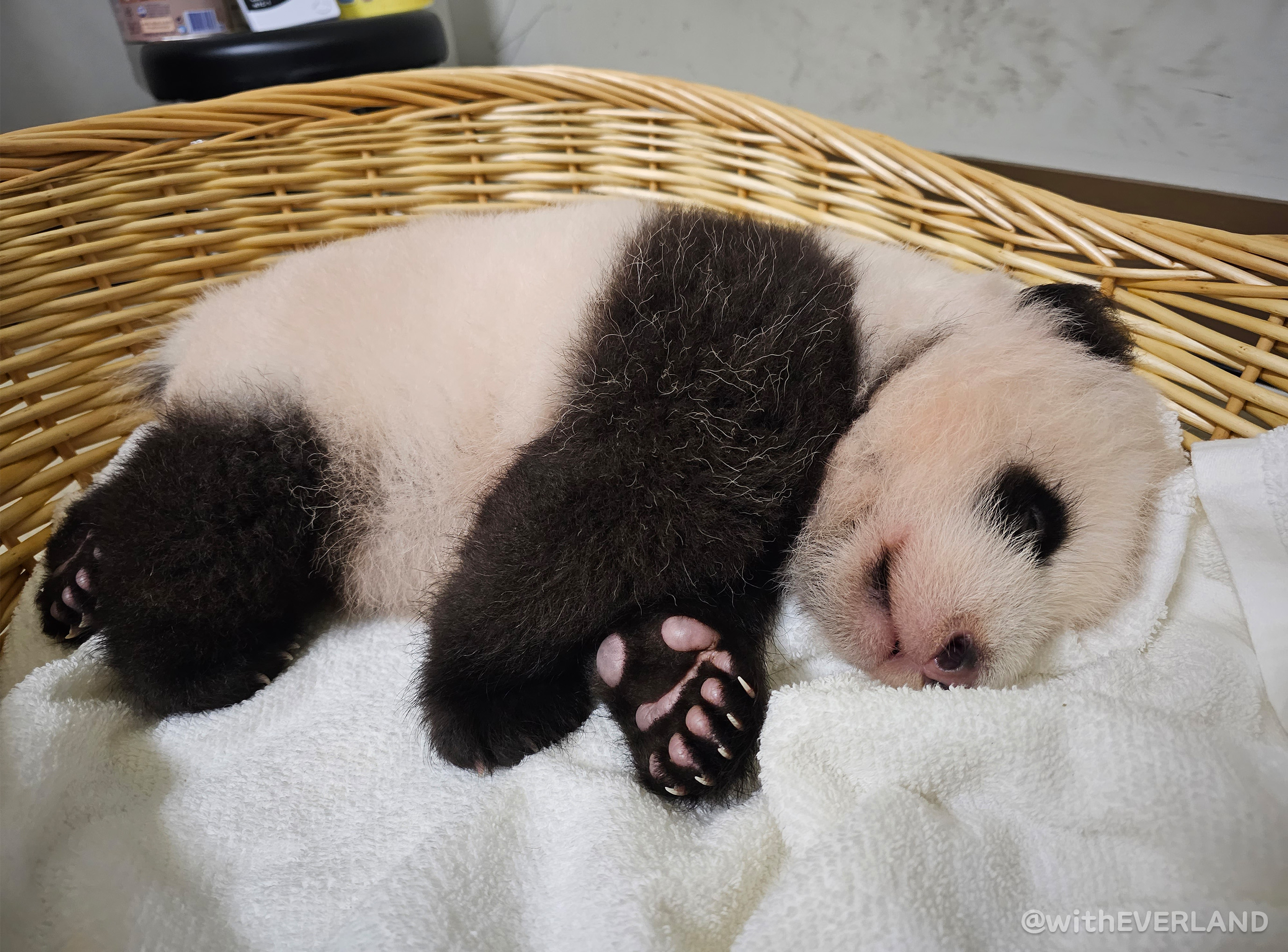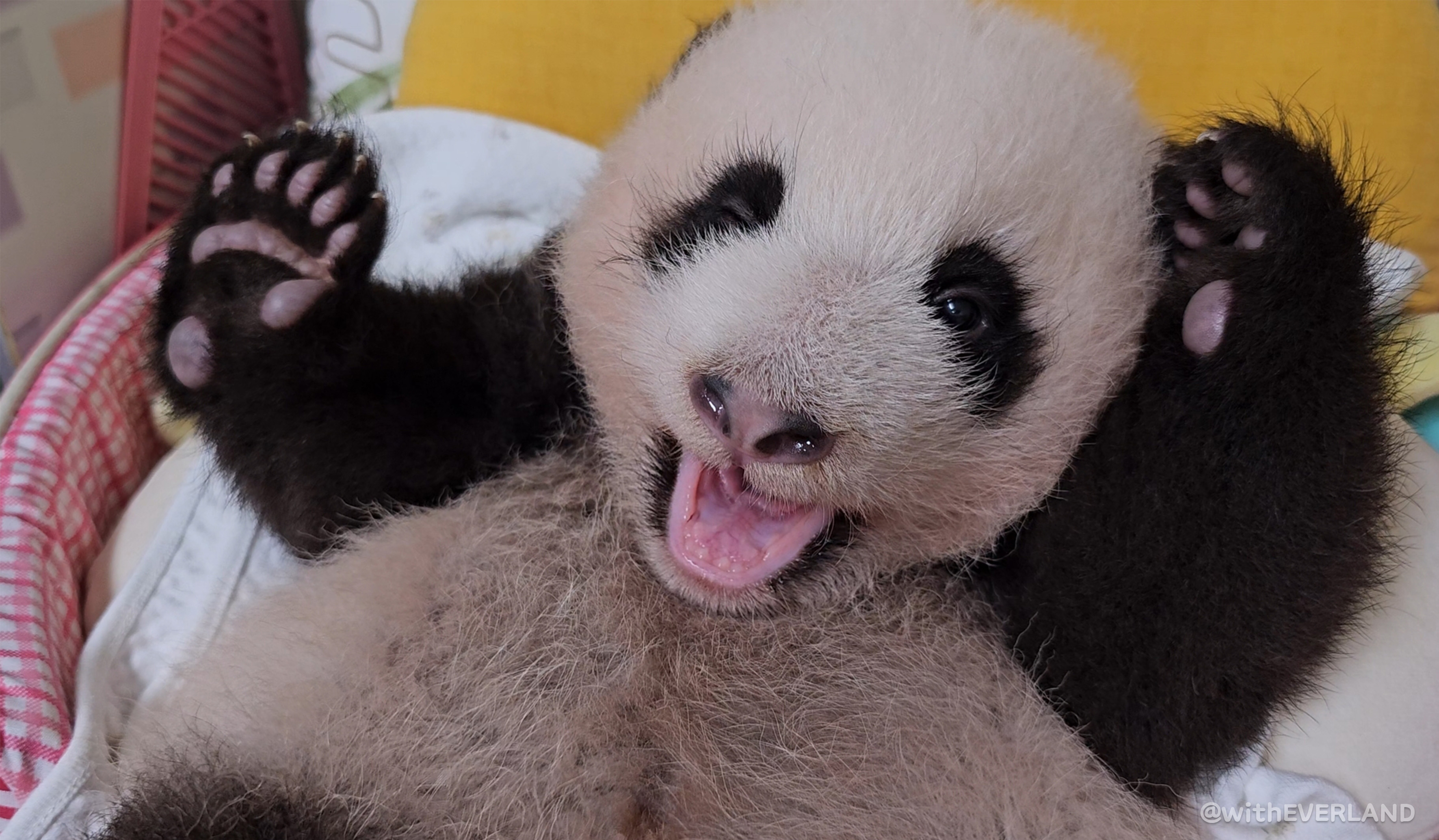 따라서 누렇기도, 핑크색이기도 한 아기판다들의 털 색은 엄마의 타액과 아기의 소변에 의한 것으로 전문가들이 판단하고 있습니다.