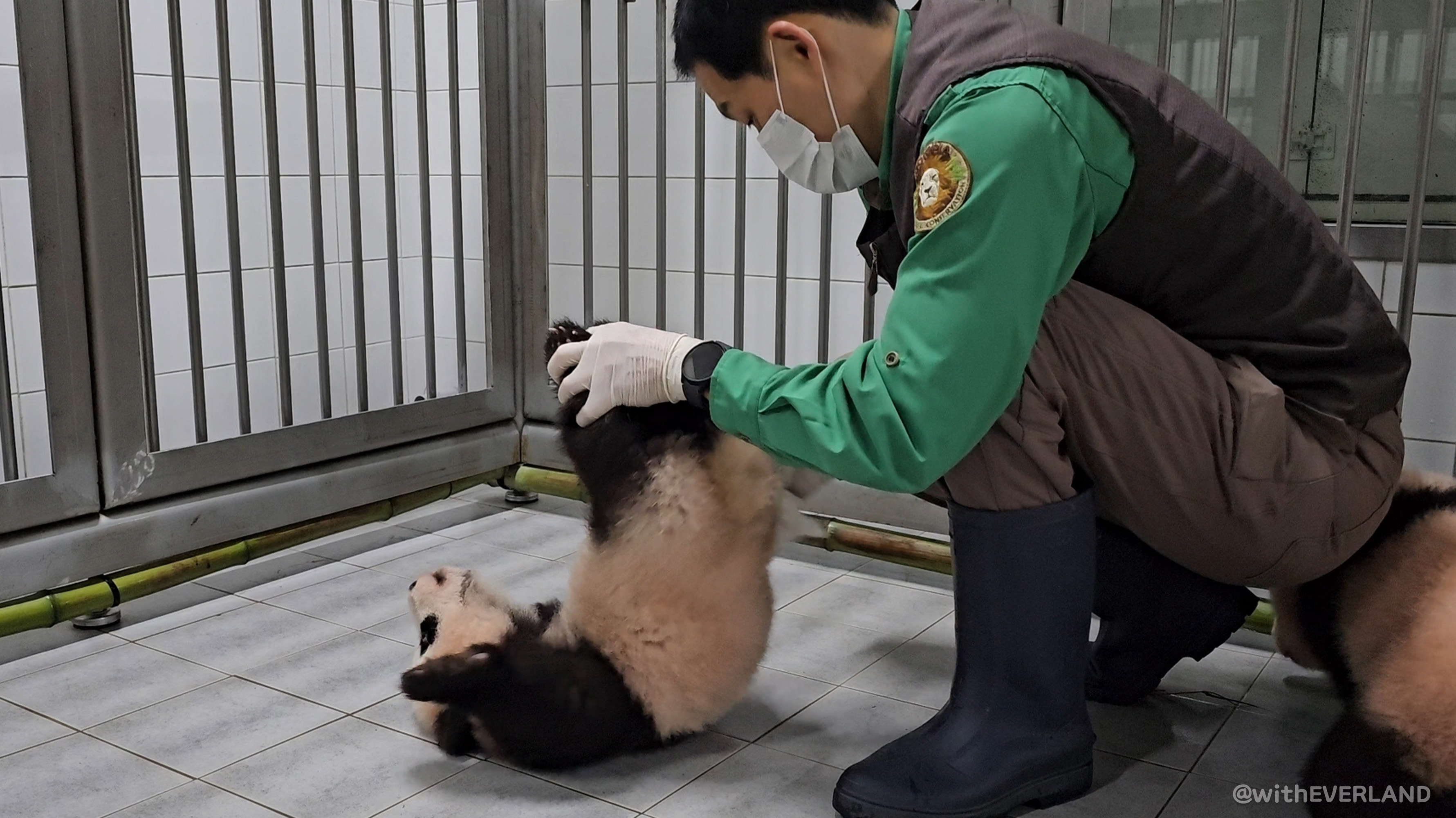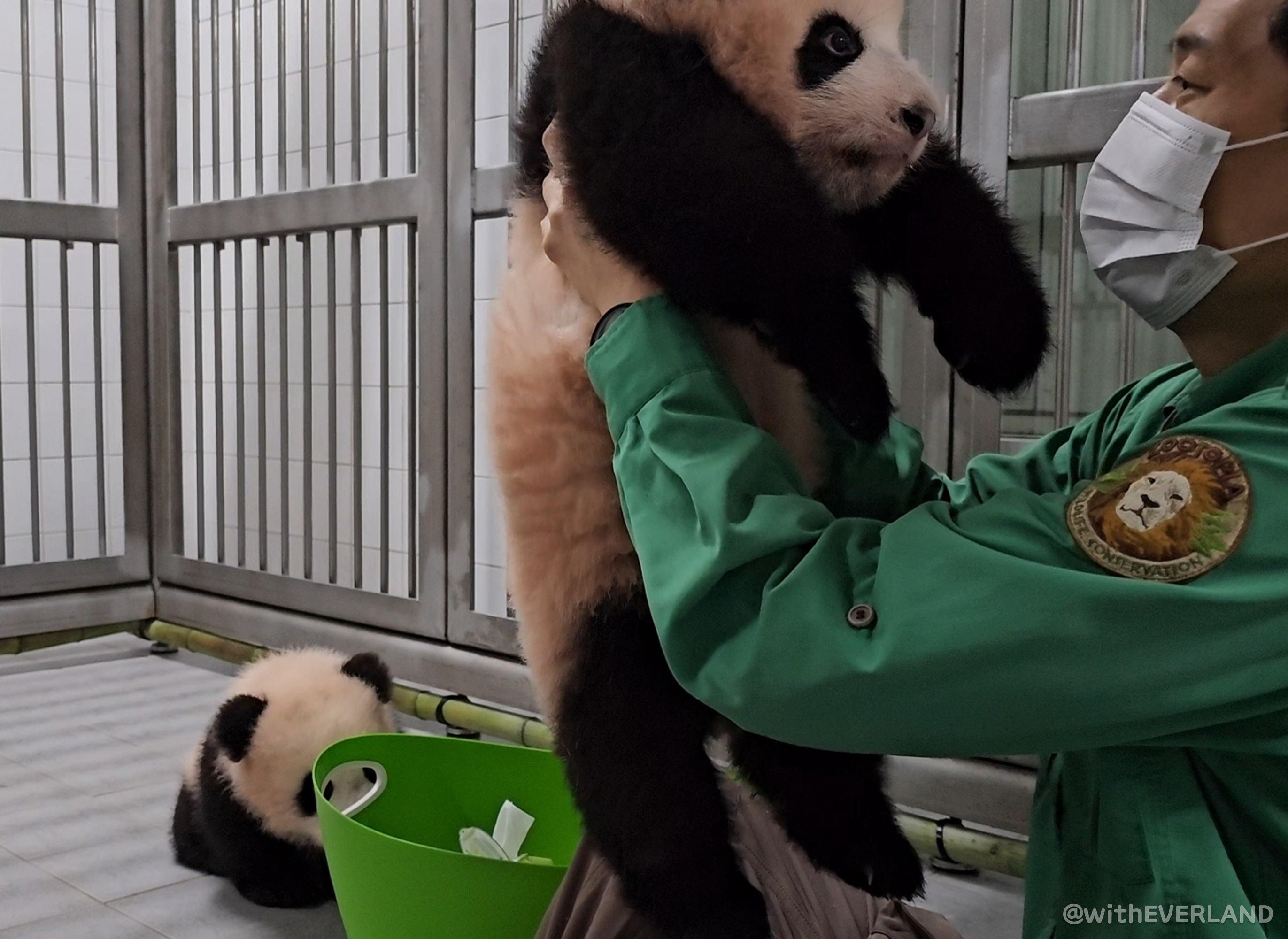 미리 아이바오의 분변을 분만실 바닥에 뿌리고, 쌍둥이에게 묻혀두었지요.
