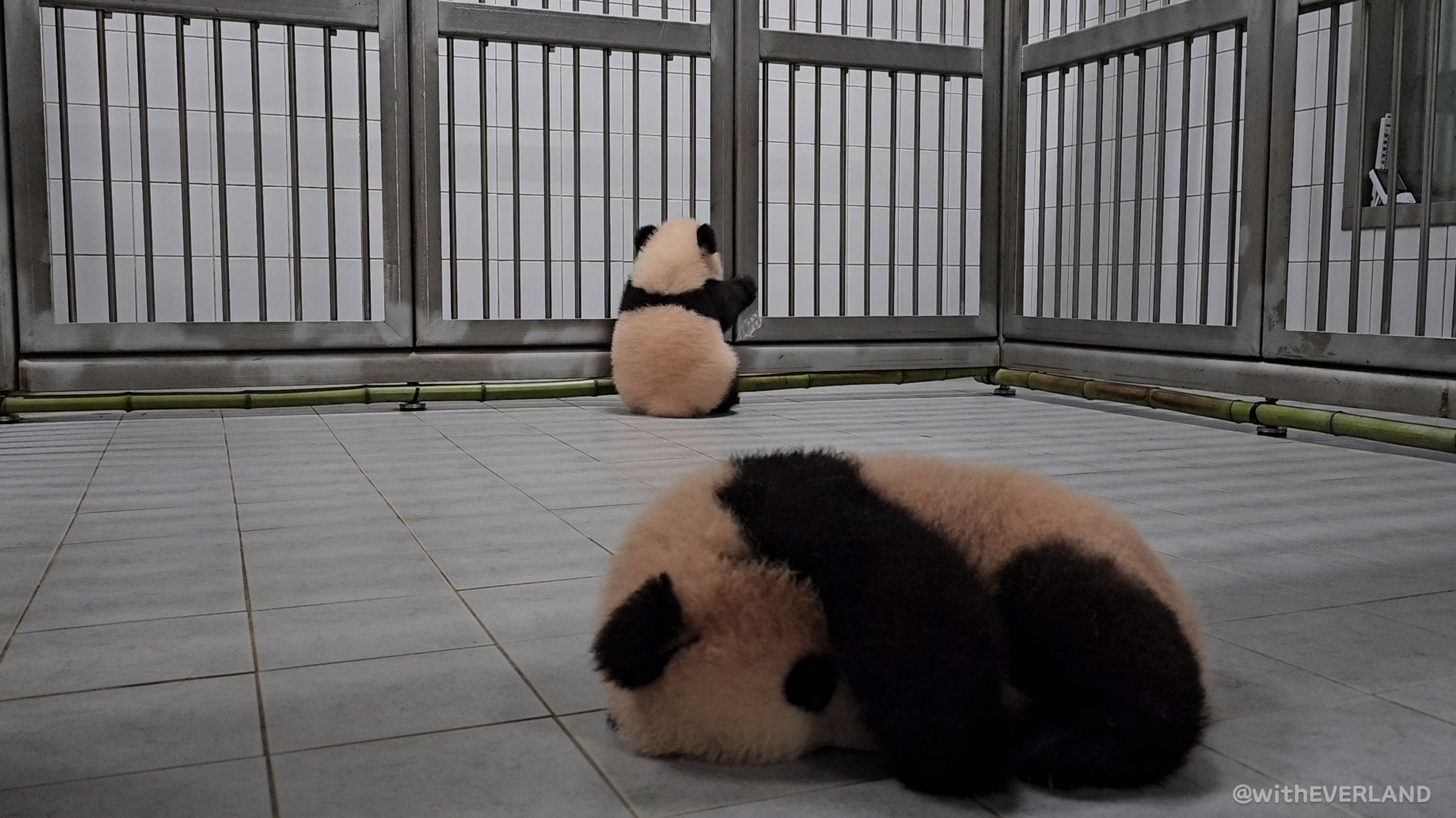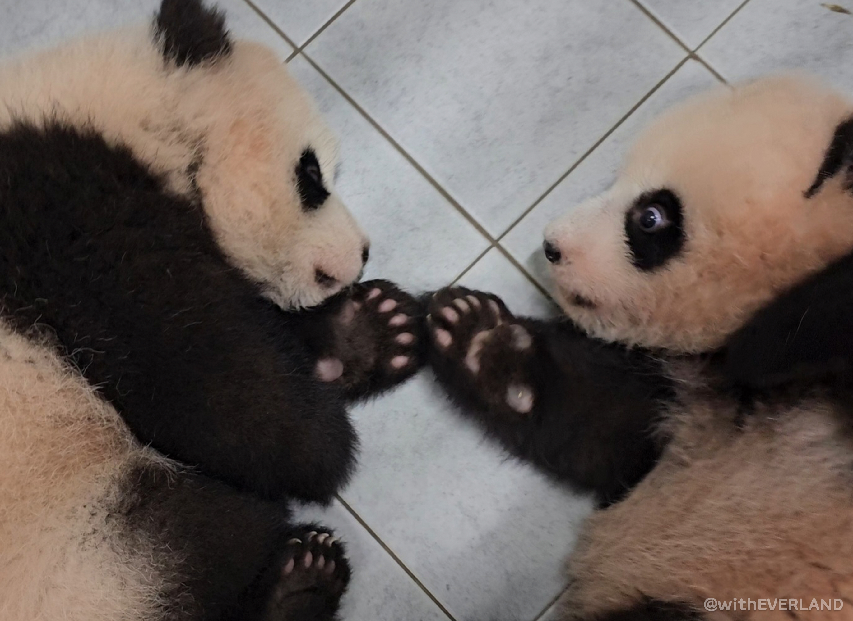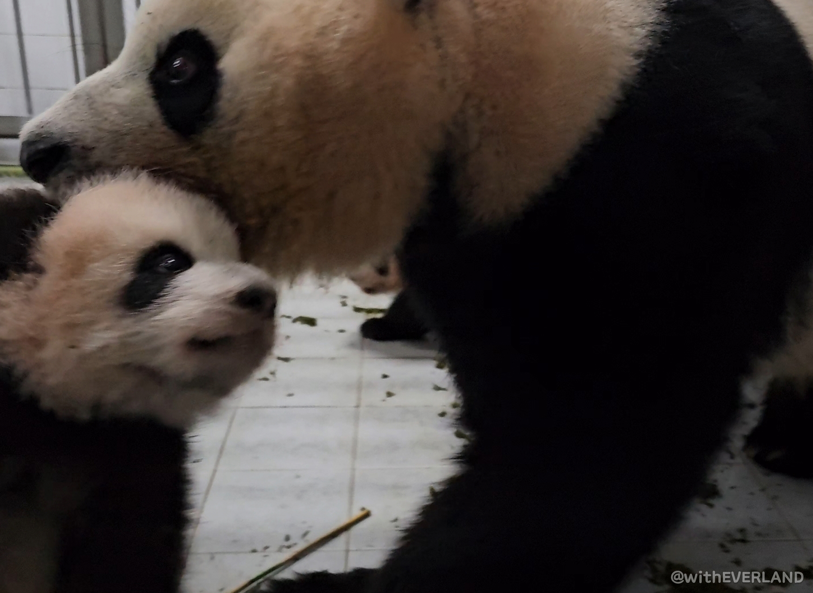 쌍둥이가 태어난 지는 어느덧 4개월, 그리고 나란히 아이바오의 품으로 가서 생활하게 된 지 6일 째가 되는 날입니다.