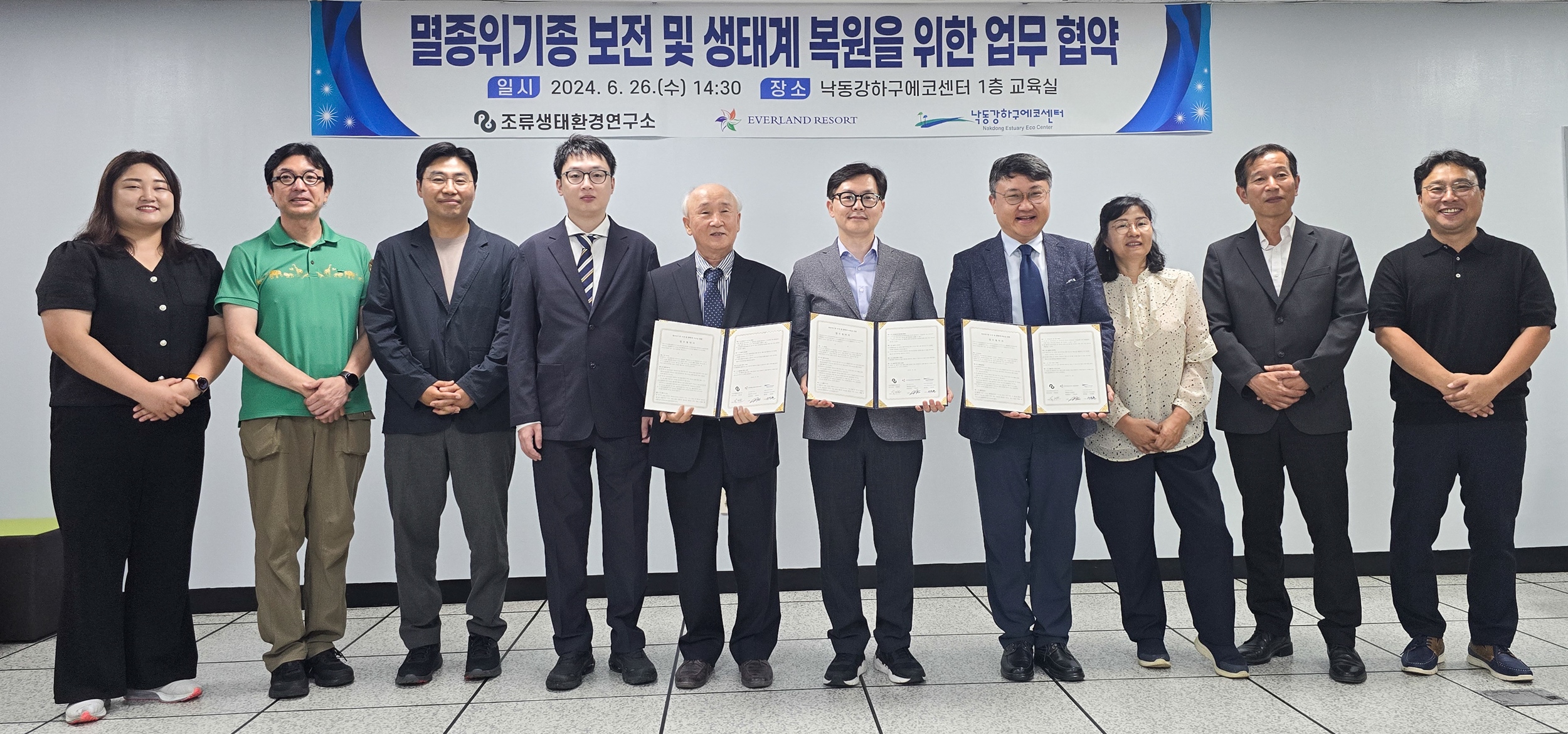 26일 낙동강하구에코센터에서 에버랜드 정동희 주토피아팀장(동물원장), 낙동강하구에코센터 서진원 센터장, 조류생태환경연구소 박희천 소장 등 3개 기관 10여명이 참석한 가운데 「멸종위기종 보전 및 생태계 복원 업무협약」을 맺고, 큰고니 야생 방사 프로젝트와 더불어 국내 멸종위기종 보전을 위한 상호 협력을 추진하기로 했다.