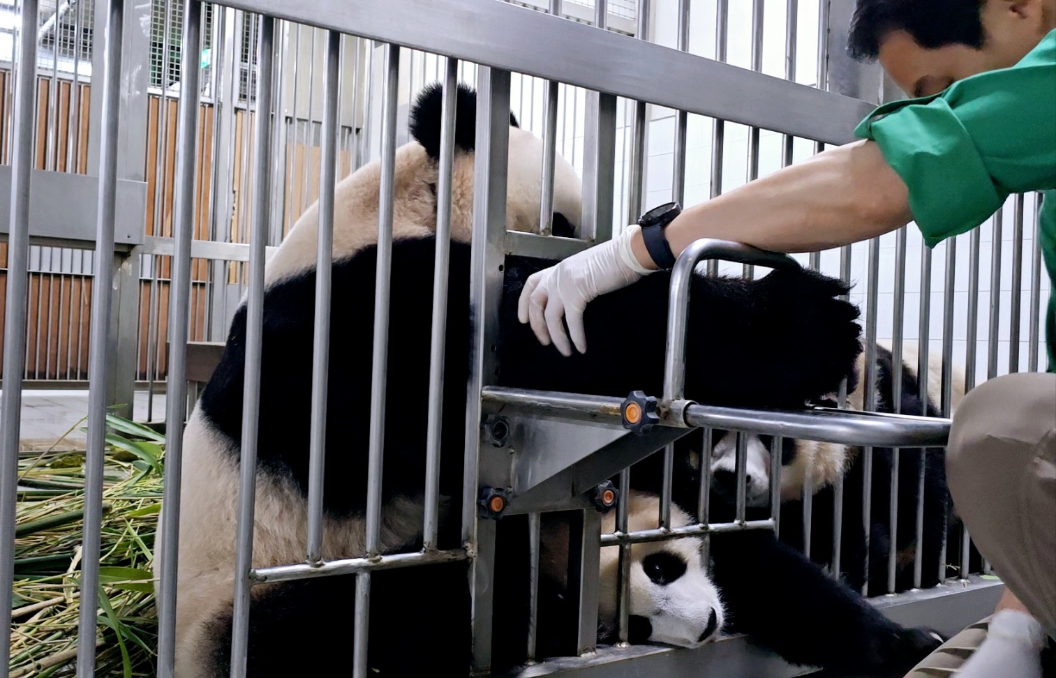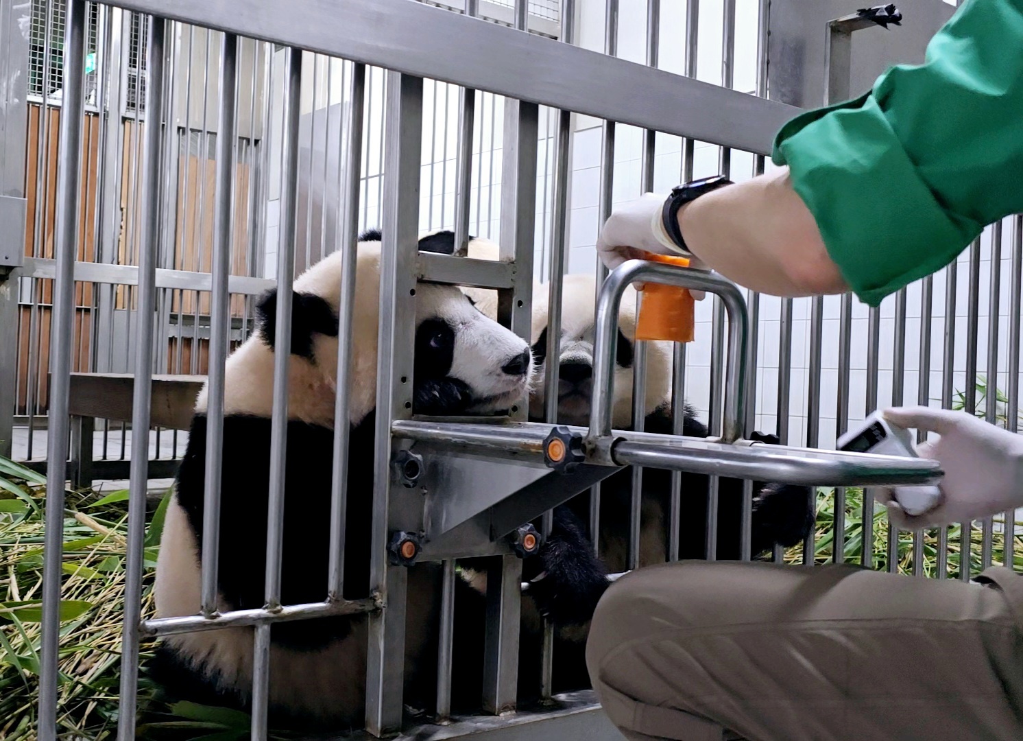 오늘 아침에 루이는 28.3kg, 후이는 33.4kg의 몸무게를 자랑하며 실내방사장으로 신나게 달려 나갔답니다.