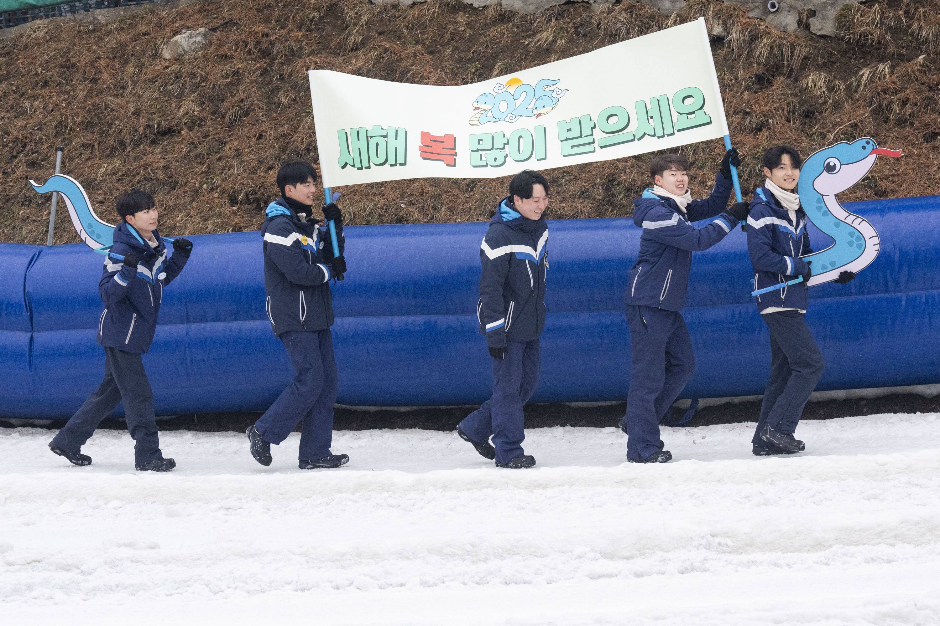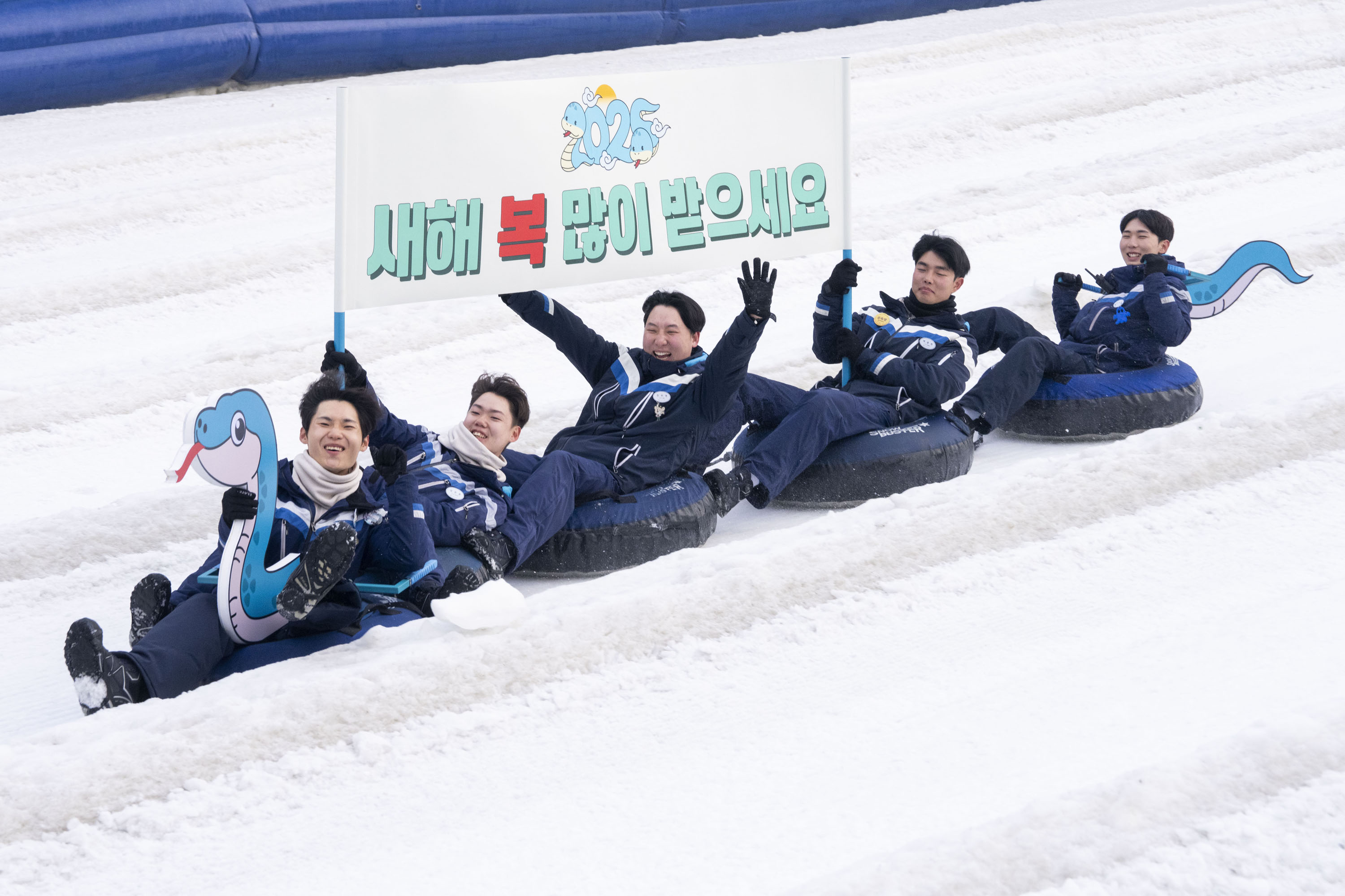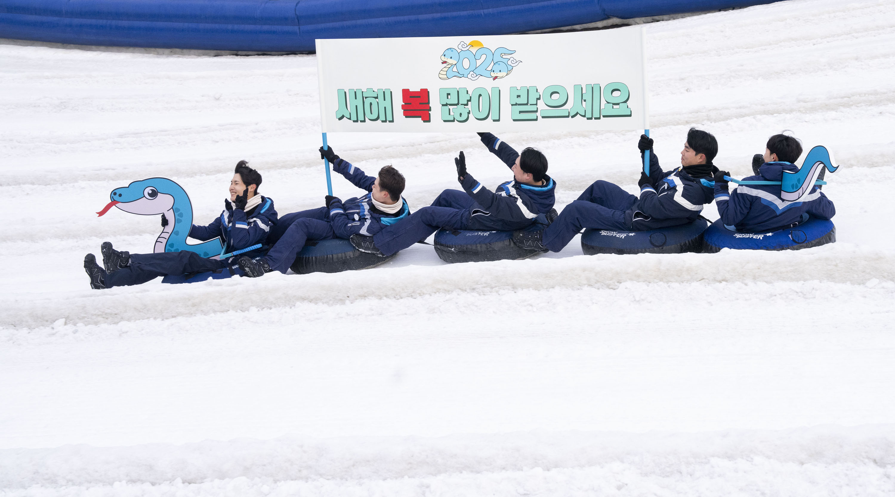 이번 주말부터 시작하는 설날 연휴를 사흘 앞둔 22일, 에버랜드 눈썰매장 스노우 버스터에서 직원들이 을사년(乙巳年) 푸른 뱀의 해를 맞아 푸른 뱀 모양으로 특별히 연출된 눈썰매를 타고 내려오며 '새해 복 많이 받으세요'가 적힌 깃발을 흔들고 있다.
