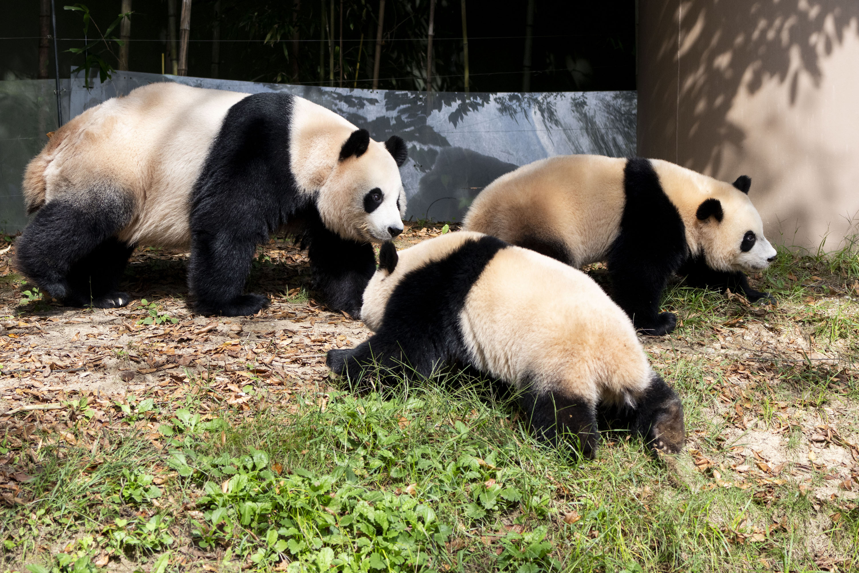 완연한 가을 날씨를 보인 3일 오전, 용인 에버랜드에서 쌍둥이 아기 판다 루이바오, 후이바오가 엄마 아이바오와 함께 야외 나들이를 즐기고 있다.