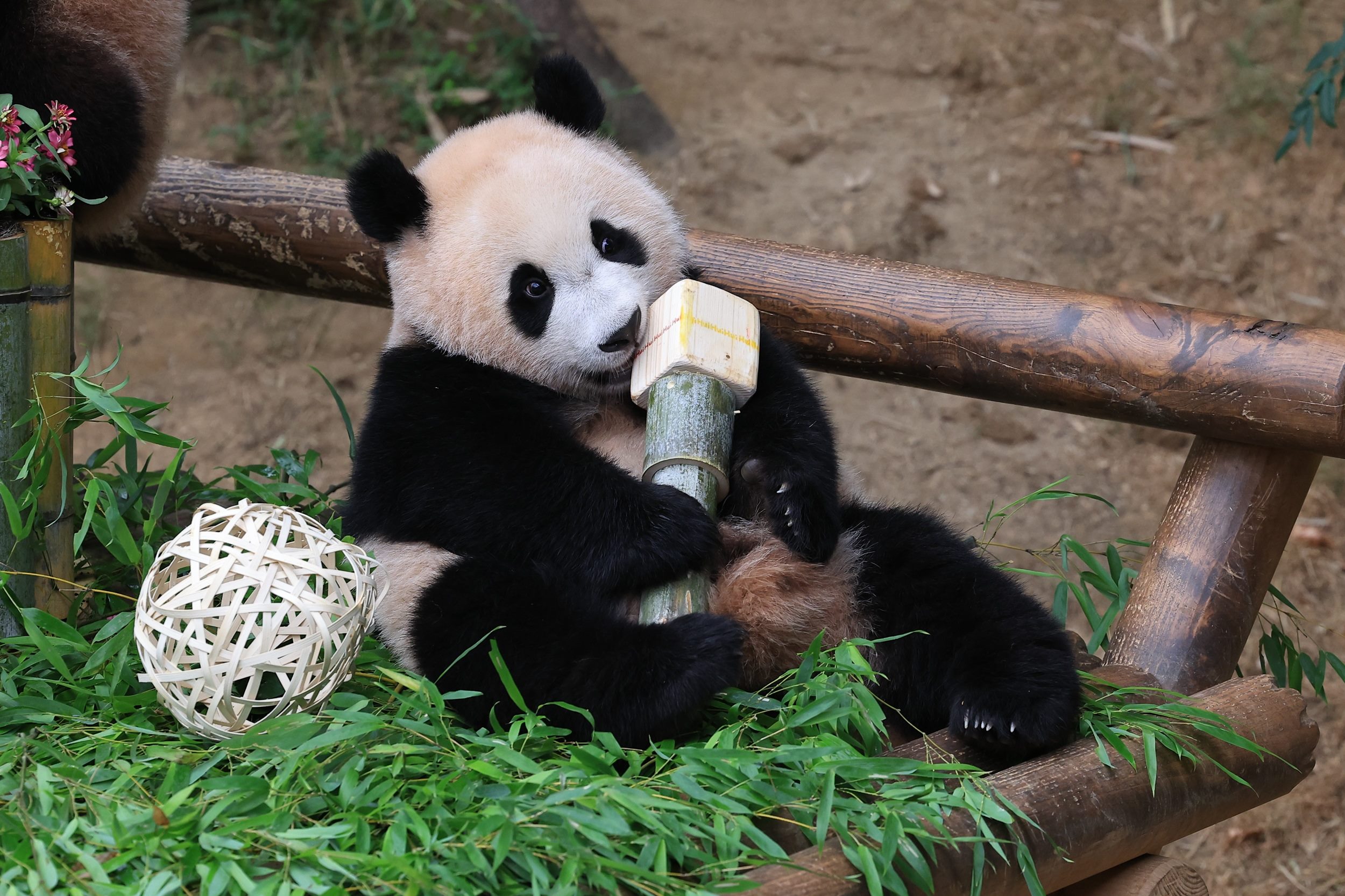 판다월드 주키퍼들은 루이바오·후이바오가 앞으로의 판생이 걸림돌 없이 쭉 뻗어나가길 바라는 마음으로 길이 2m, 너비 1m 크기의 나무 자동차와 대나무, 워토우, 당근 등으로 만든 지름 1m 대형 케이크를 선물했다.