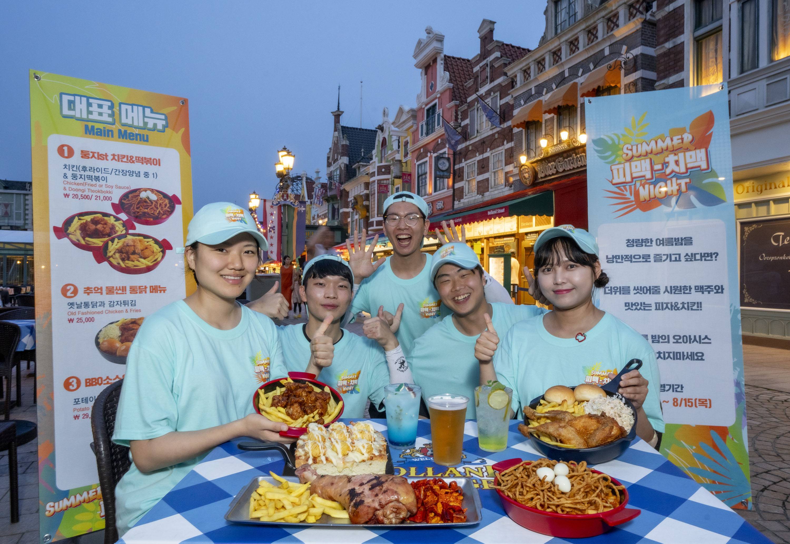 먼저 네덜란드 노천 카페 분위기의 홀랜드빌리지에서는 낭만적인 여름밤 분위기에서 피맥(피자+맥주), 치맥(치킨+맥주) 등을 즐길 수 있는 '썸머 피치 나이트'가 매일 저녁 5시부터 열린다.