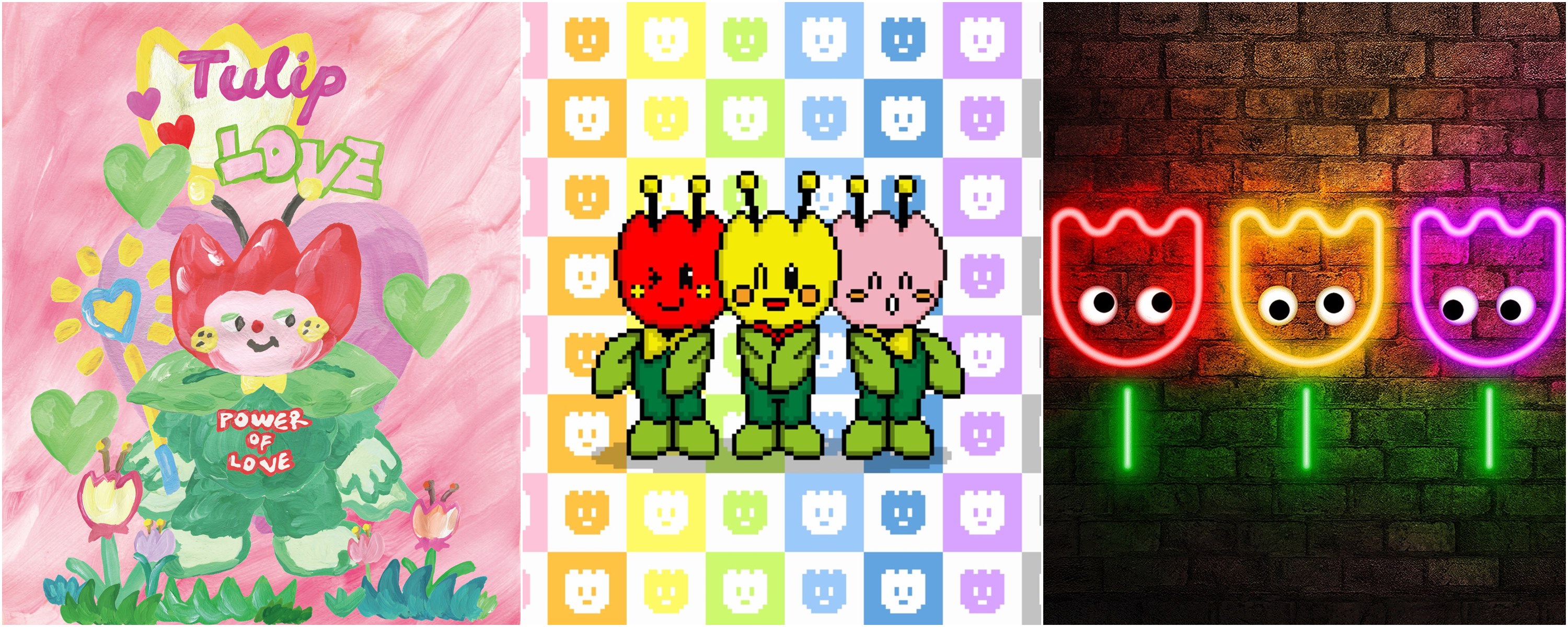 MZ세대에게 인기가 많은 이슬로 작가는 사랑, 행복, 꿈을 상징하는 튤리 히어로즈 캐릭터를 제작해 NFT로 선보이며, 국립현대미술관 추미림 작가는 픽셀을 활용한 레트로 감성의 튤리 캐릭터를 NFT 영상으로 제작했다.