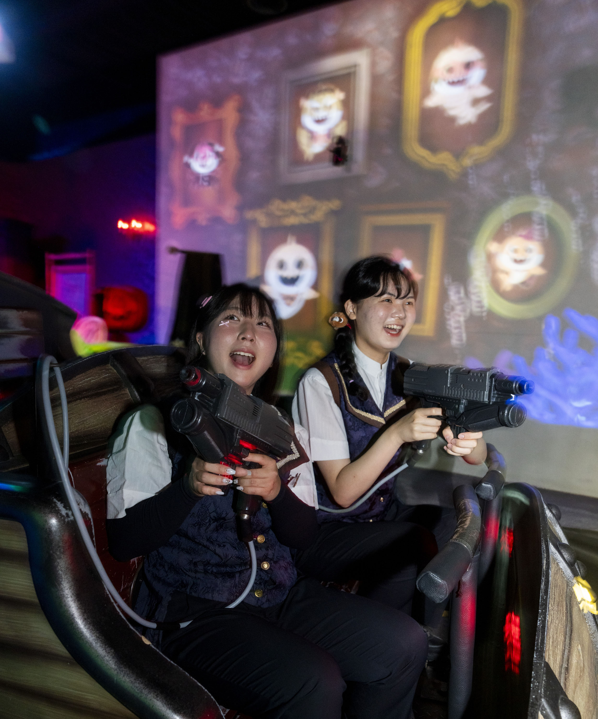 슈팅고스트는 4인승 열차를 타고 이동하면서 전후좌우 360도 화면에 나타나는 유령들을 전자총으로 무찌르는 실내 슈팅 라이드 시설이다.