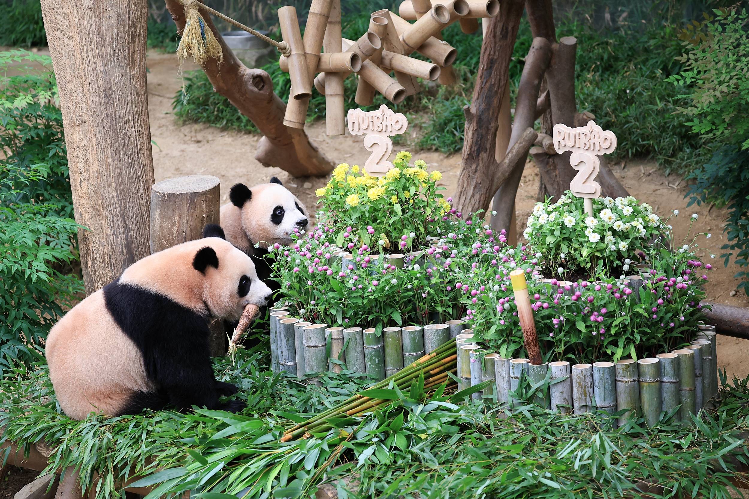 생일잔치에서 주키퍼들은 루이바오, 후이바오를 위해 판다가 좋아하는 대나무로 만든 대형 케이크를 만들어줬으며, 여름을 시원하게 보내기 위한 얼음바위(cooled rock)와 대나무 장난감 등 다양한 인리치먼트(행동풍부화) 놀잇감을 선물했다.