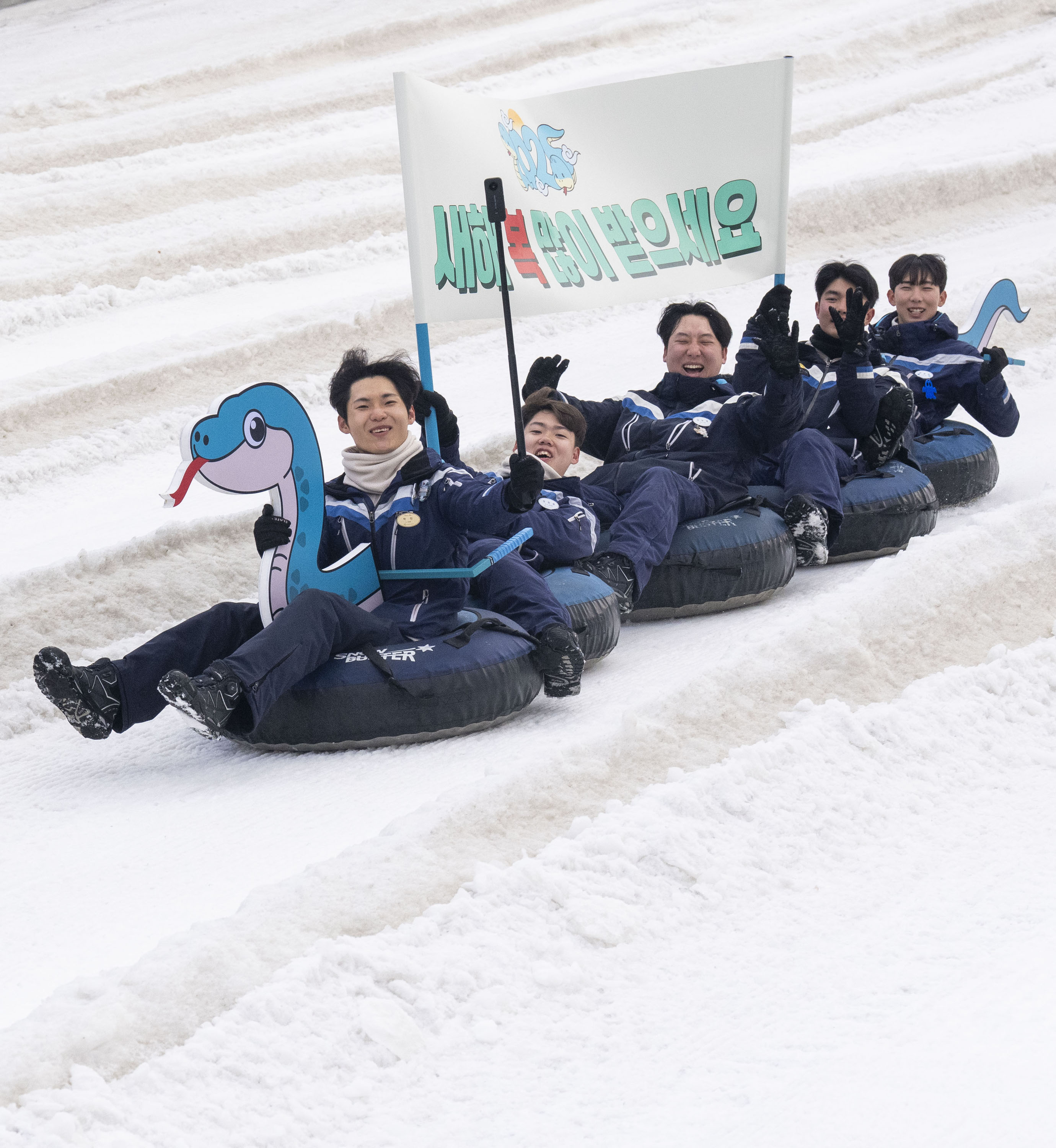 이번 주말부터 시작하는 설날 연휴를 사흘 앞둔 22일, 에버랜드 눈썰매장 스노우 버스터에서 직원들이 을사년(乙巳年) 푸른 뱀의 해를 맞아 푸른 뱀 모양으로 특별히 연출된 눈썰매를 타고 내려오며 '새해 복 많이 받으세요'가 적힌 깃발을 흔들고 있다.