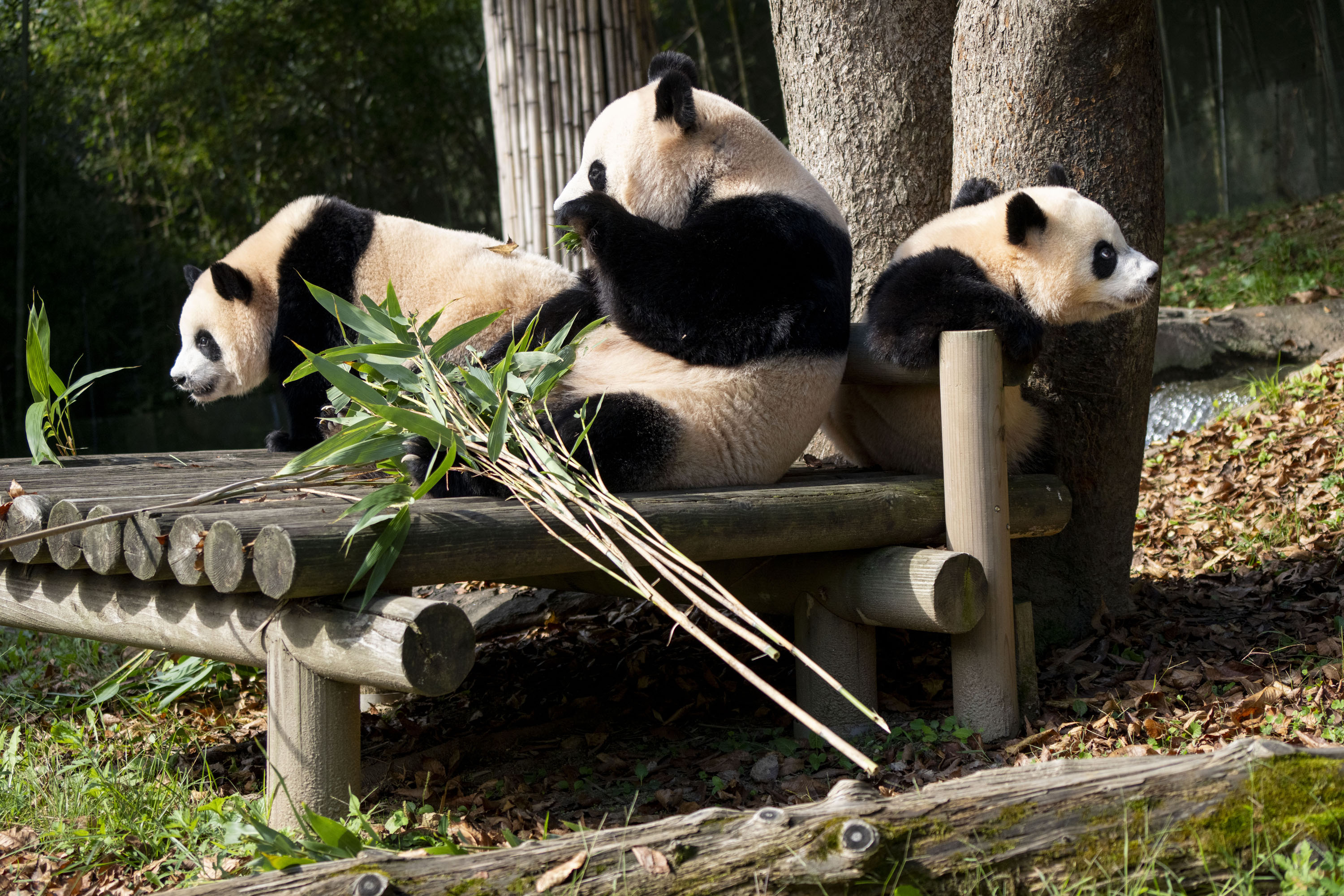 완연한 가을 날씨를 보인 3일 오전, 용인 에버랜드에서 쌍둥이 아기 판다 루이바오, 후이바오가 엄마 아이바오와 함께 야외 나들이를 즐기고 있다.