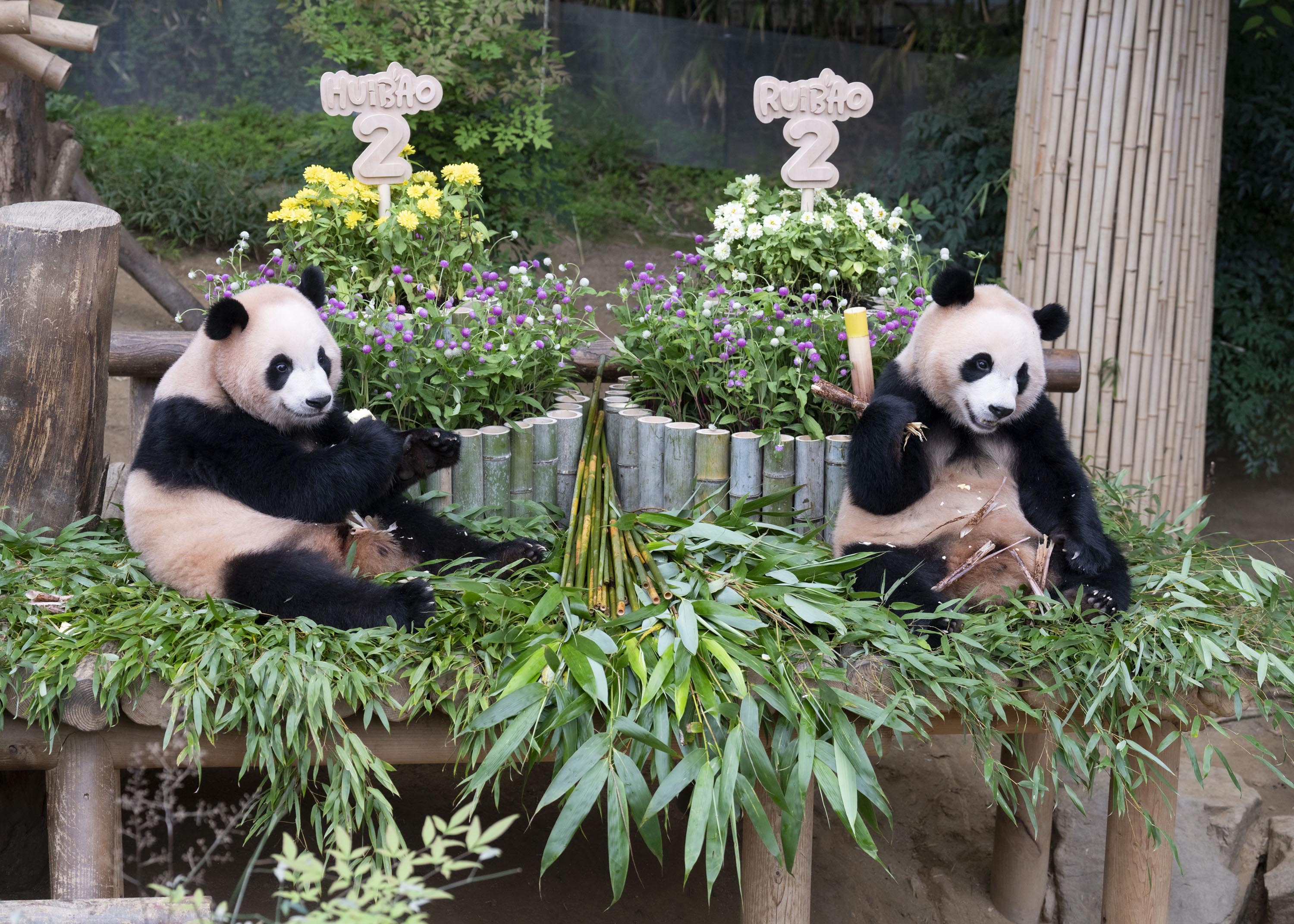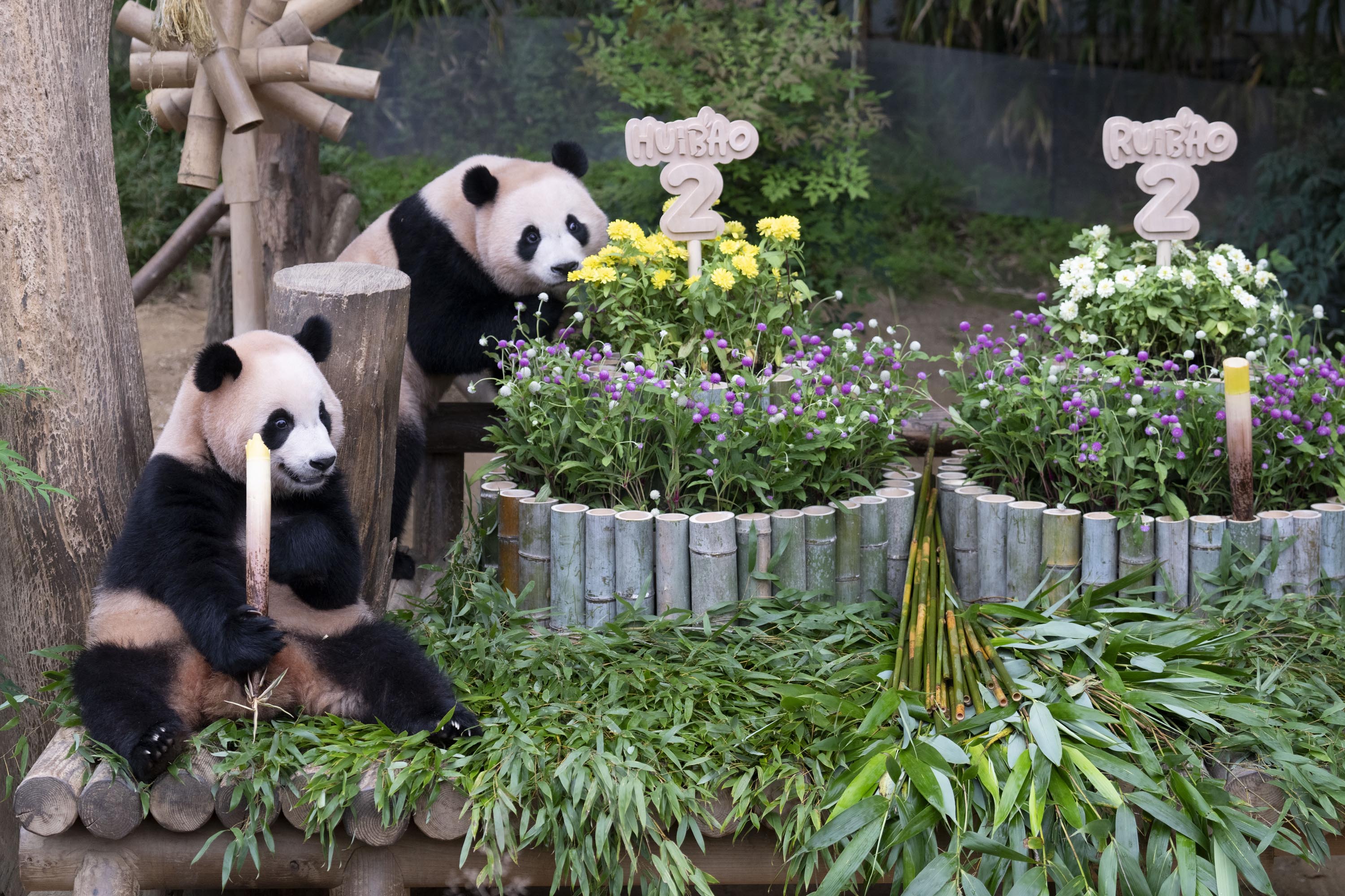 생일잔치에서 주키퍼들은 루이바오, 후이바오를 위해 판다가 좋아하는 대나무로 만든 대형 케이크를 만들어줬으며, 여름을 시원하게 보내기 위한 얼음바위(cooled rock)와 대나무 장난감 등 다양한 인리치먼트(행동풍부화) 놀잇감을 선물했다.