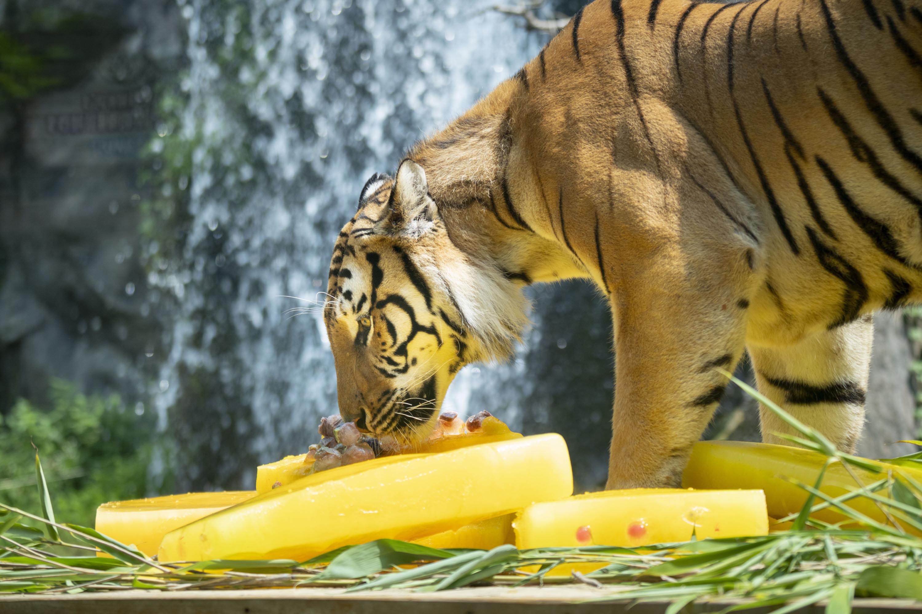 중복을 하루 앞둔 오늘(29일), '세계 호랑이의 날'을 맞아 에버랜드 타이거밸리에 살고 있는 호랑이들이 비타민 얼음 케이크를 먹고 있다.