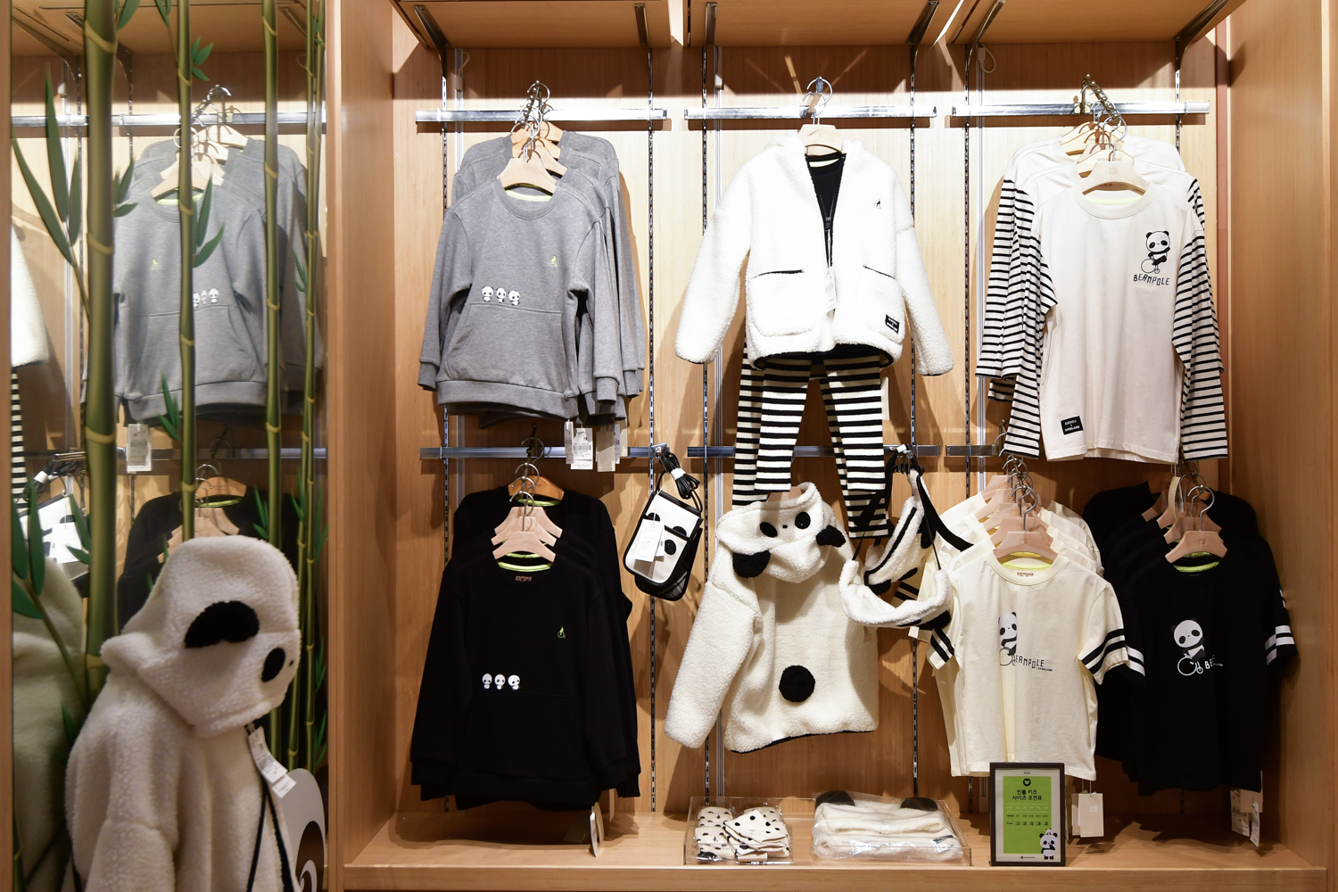 점퍼와 티셔츠, 하의가 진열되어 있어요.