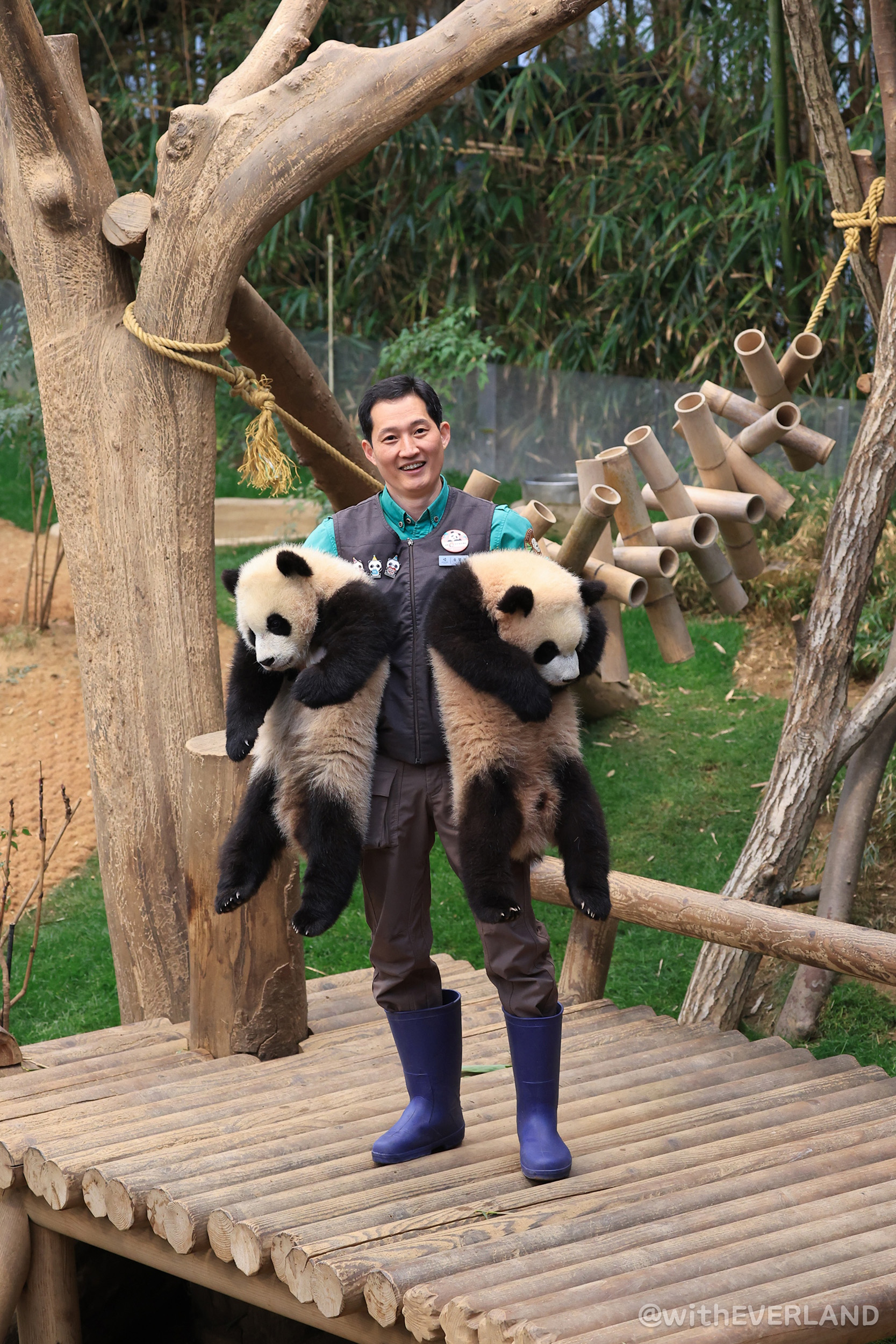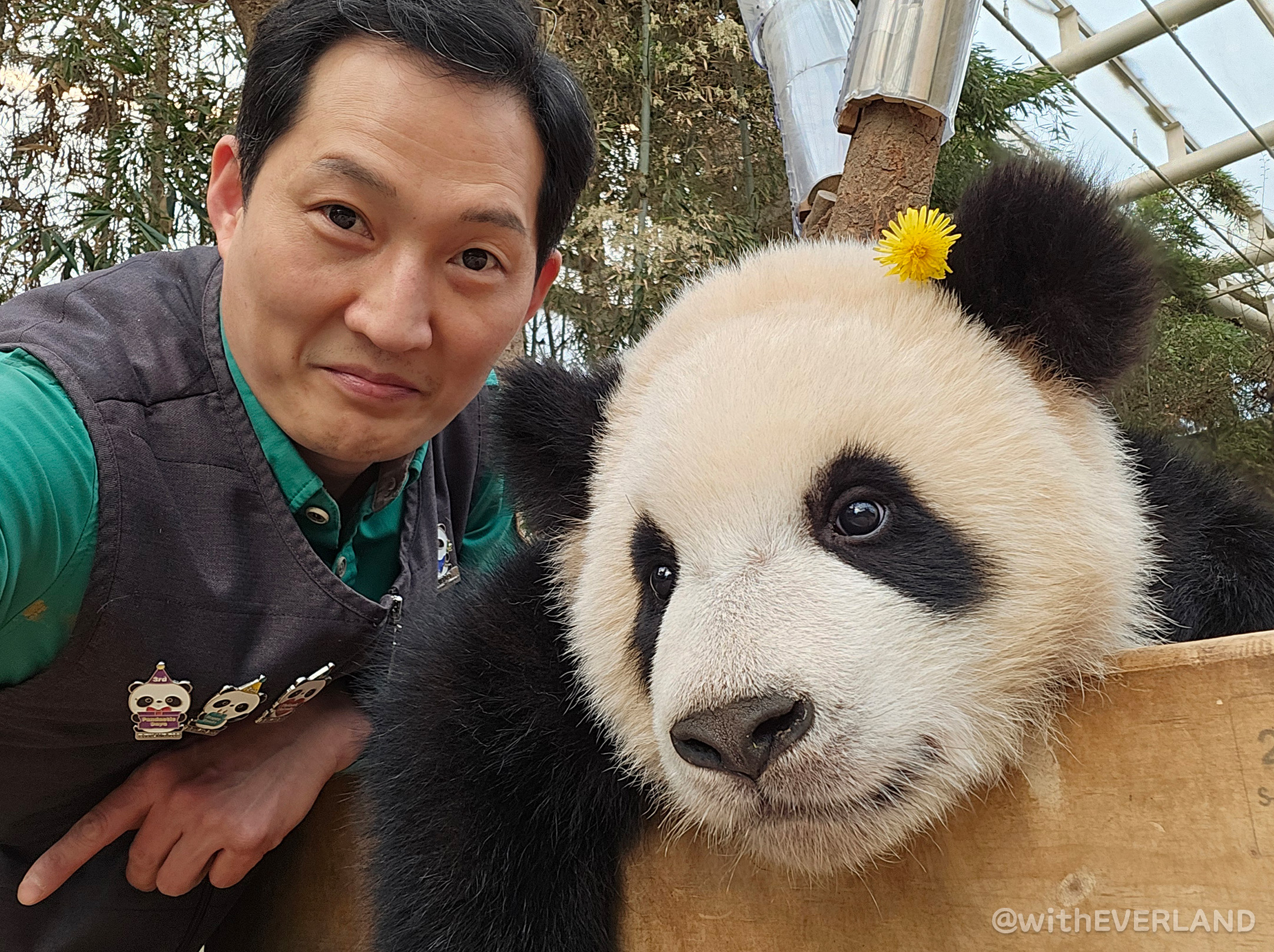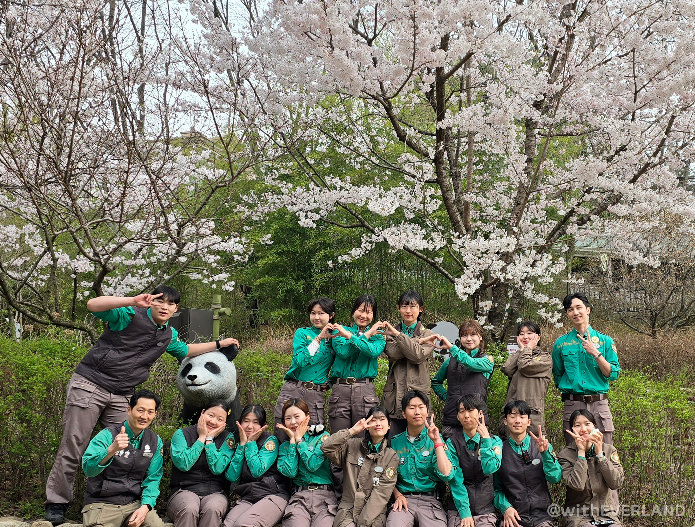 그러면 사육사들은 아침에 모여서 예쁜 판다월드를 배경으로 기념 사진 촬영을 하지요.