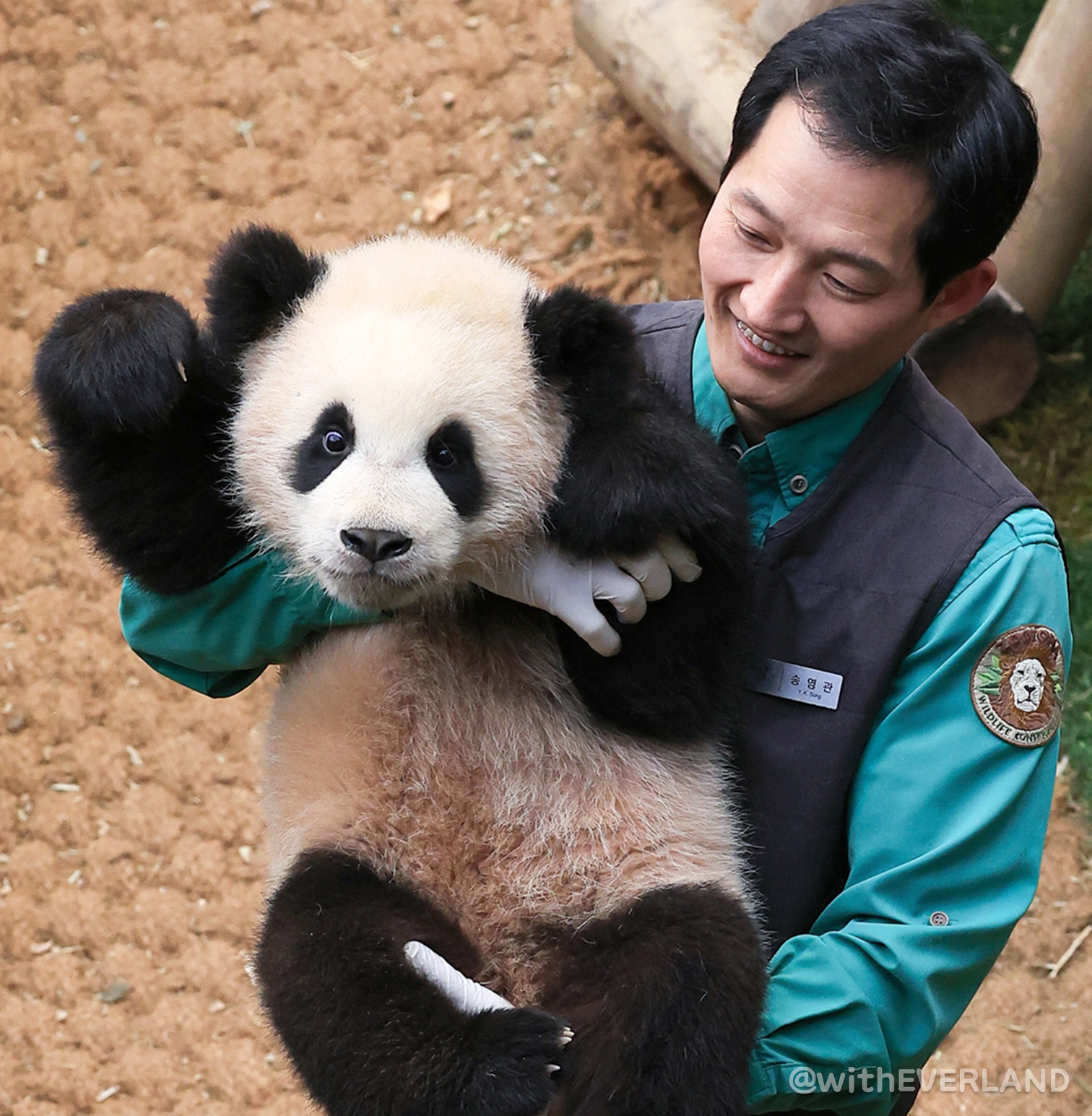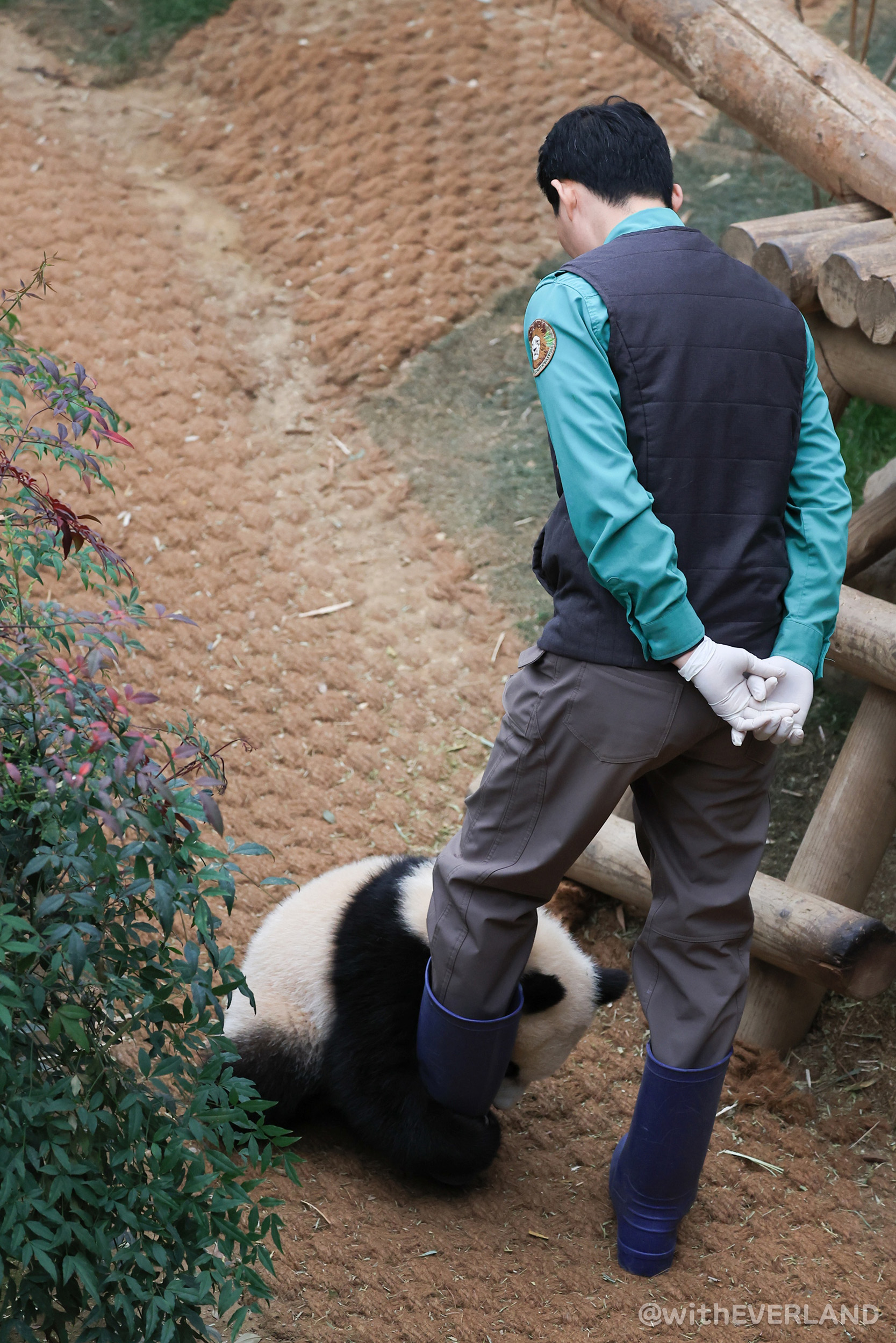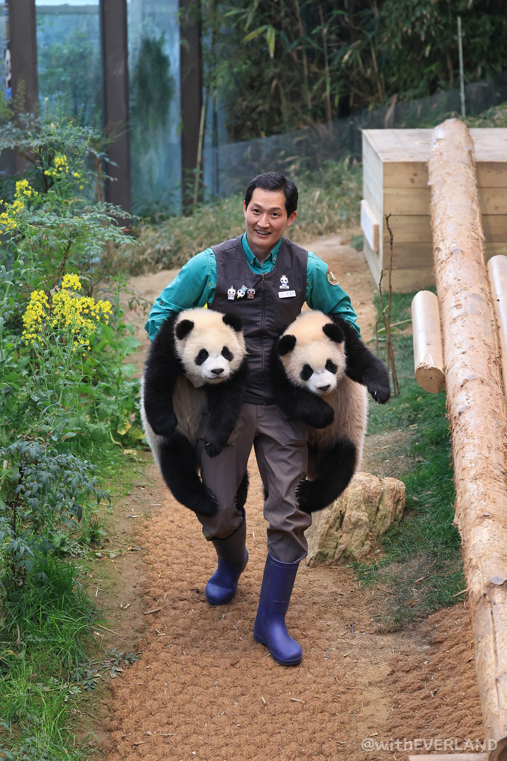 그러면 사육사들은 아침에 모여서 예쁜 판다월드를 배경으로 기념 사진 촬영을 하지요.