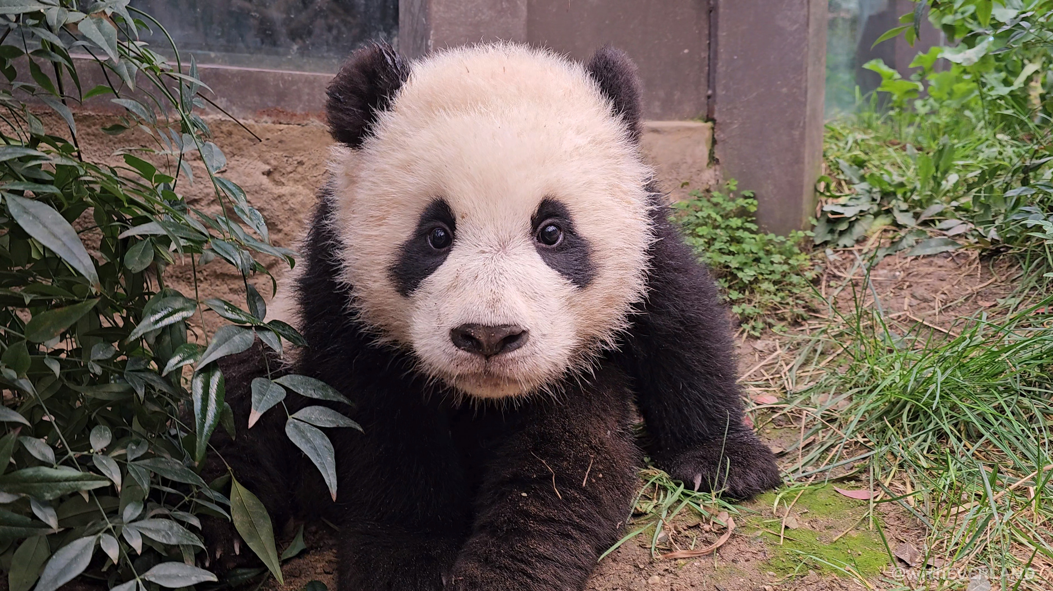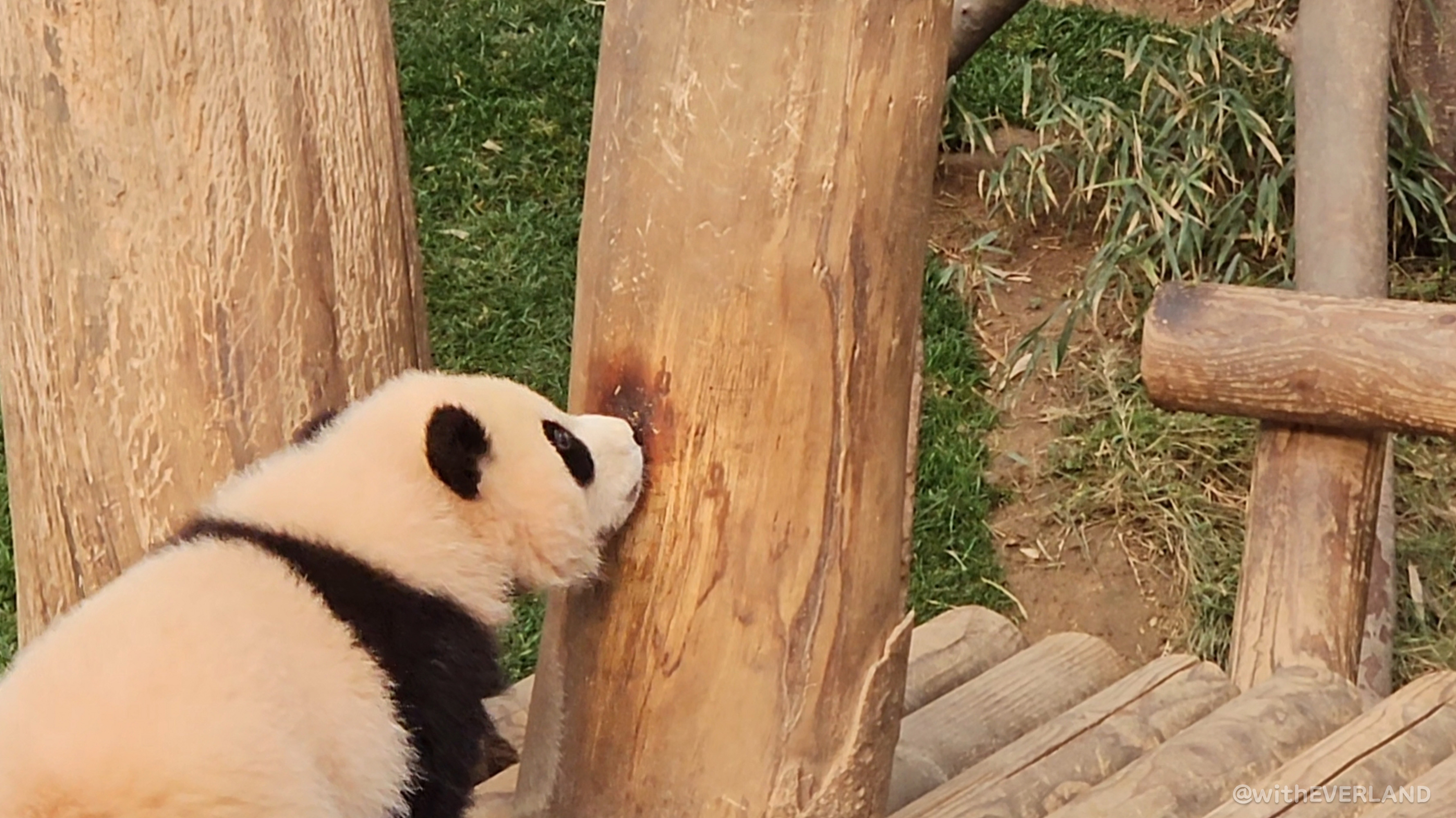 실내방사장 음수대 주변의 대나무 밭 근처에 있는 루이바오에게 다가갔는데, 주변에서 꼬맹이들 특유의 분변 냄새가 진동을 했어요.