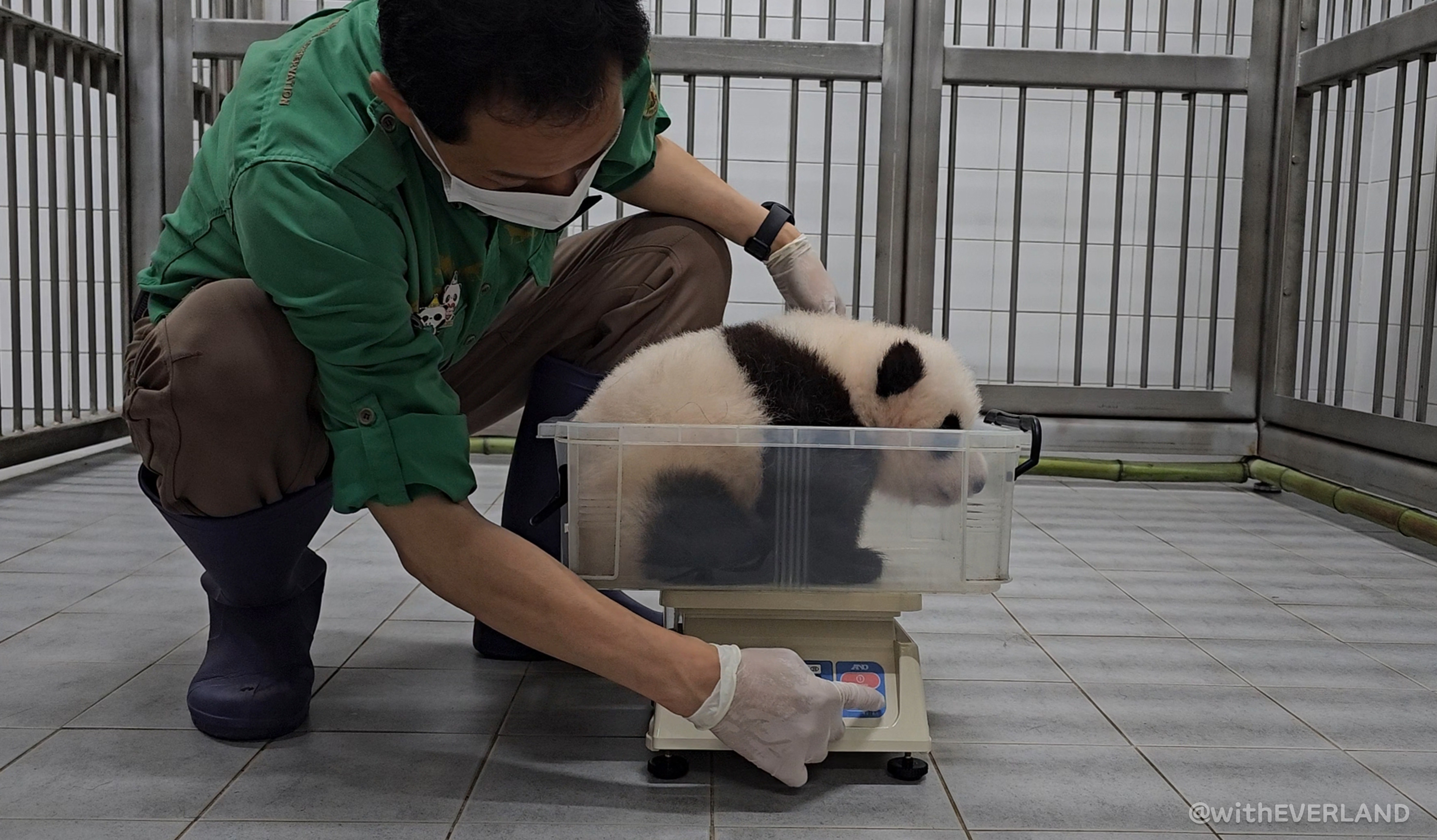 사육사들은 그 시간을 이용해 혼자 남은 아기의 체중을 측정하고