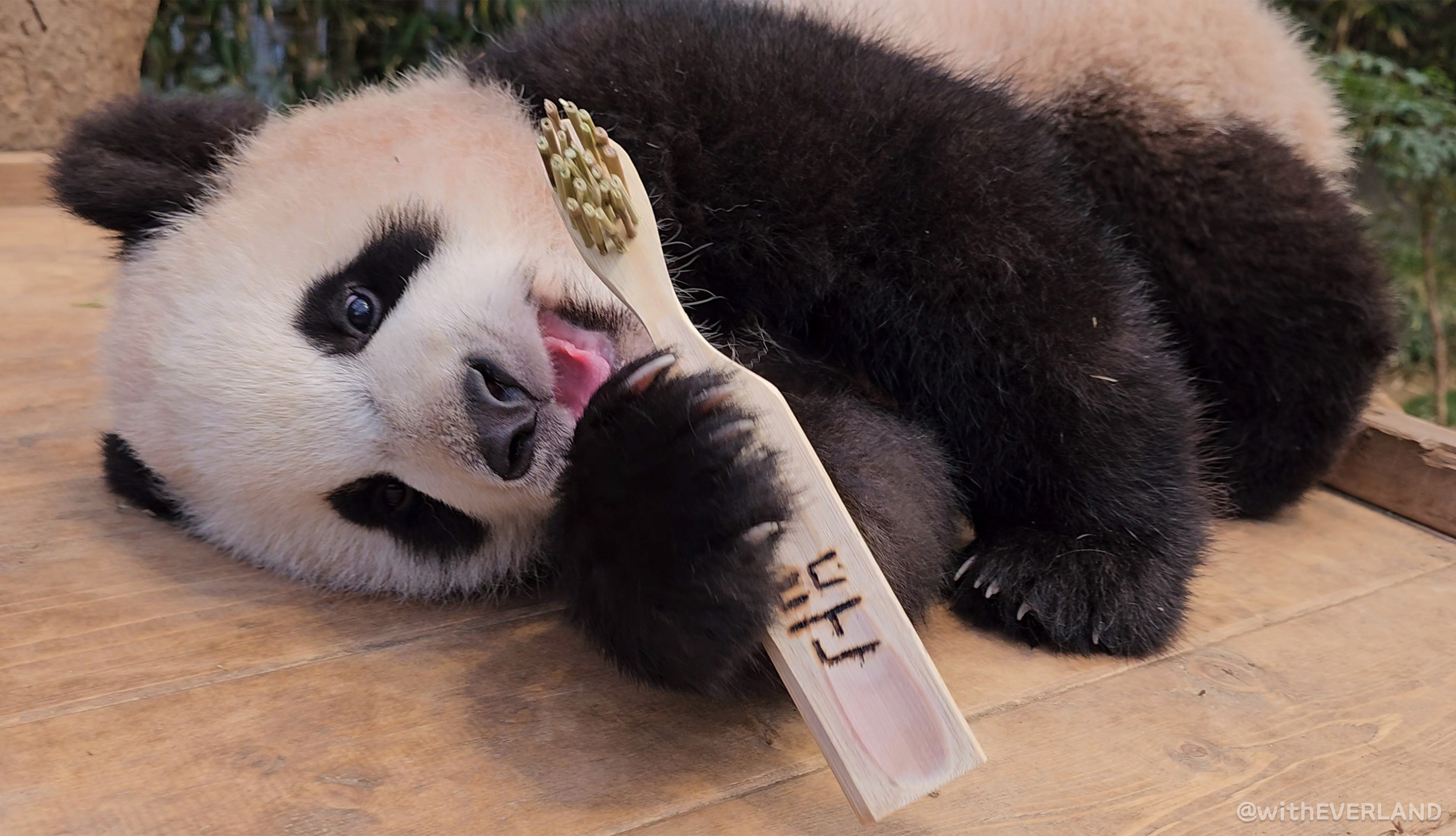 푸바오 언니에게 선물한 것처럼 꼬맹이들에게도 '뚠칫솔'을 한 개씩 선물해 주었어요. 앙증맞은 자세로 앉아서 신기