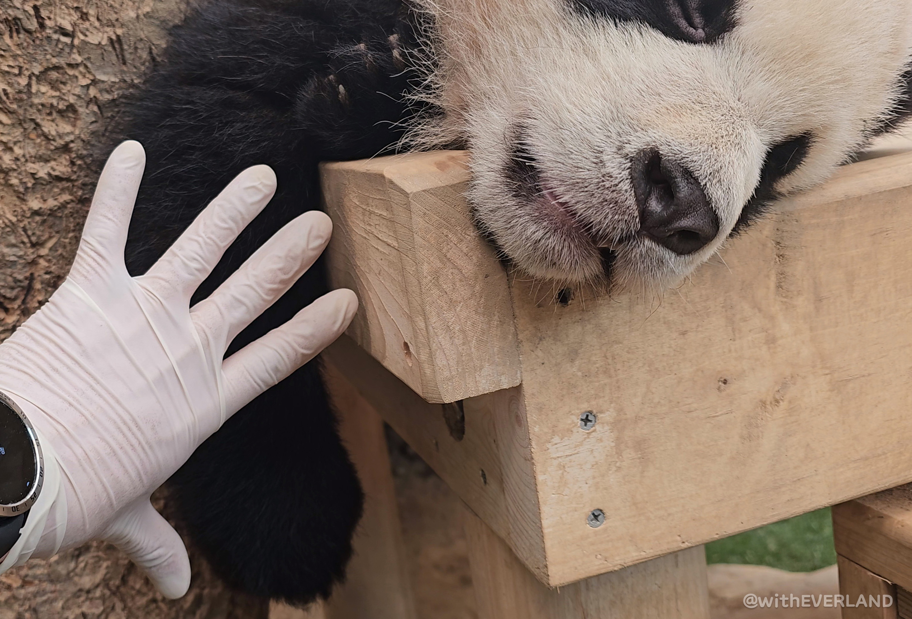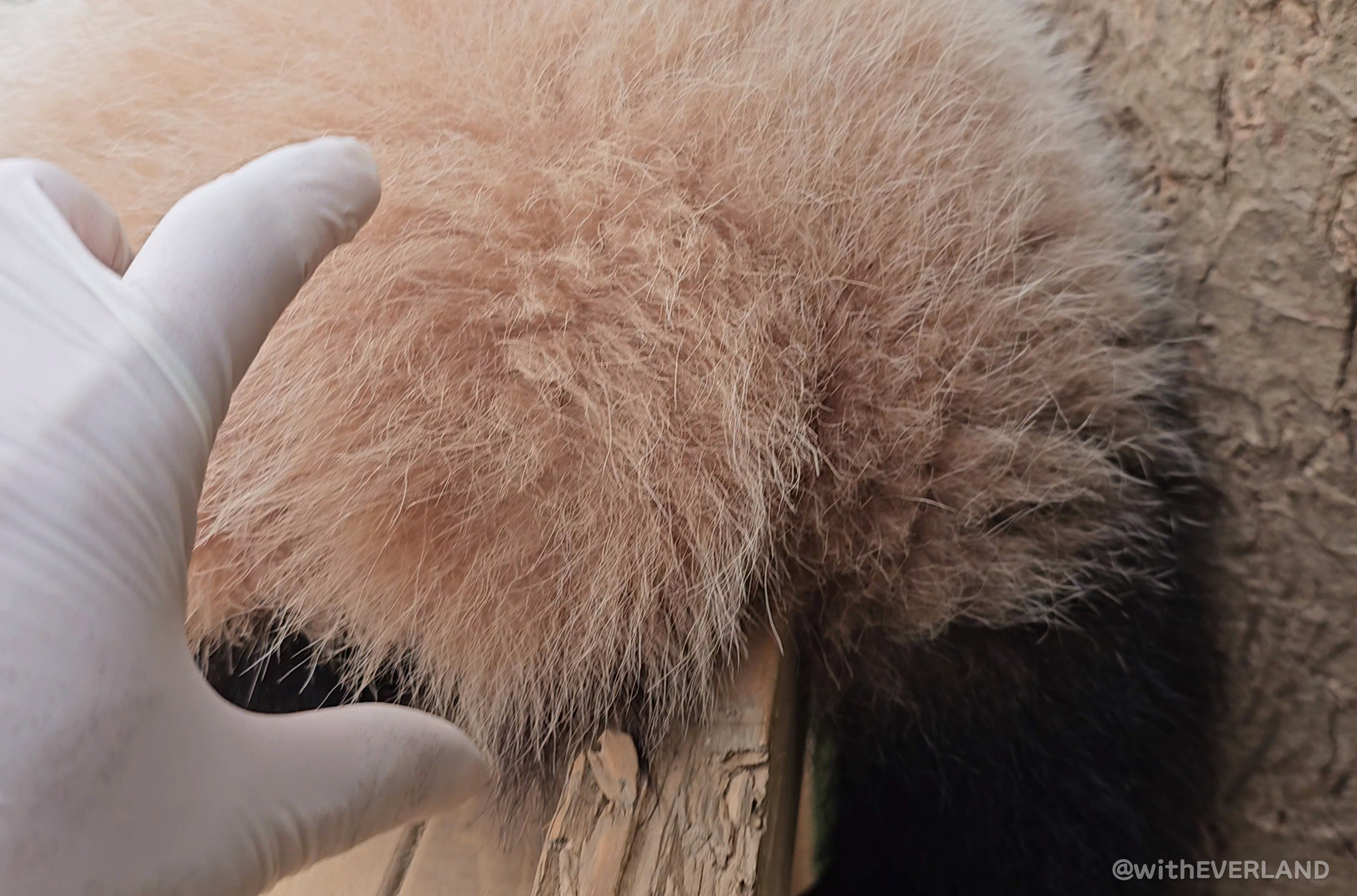 아이바오가 실내방사장 메타세콰이아 플레이봉의 껍질을 열심히 벗기는 모습이 포착되었어요.