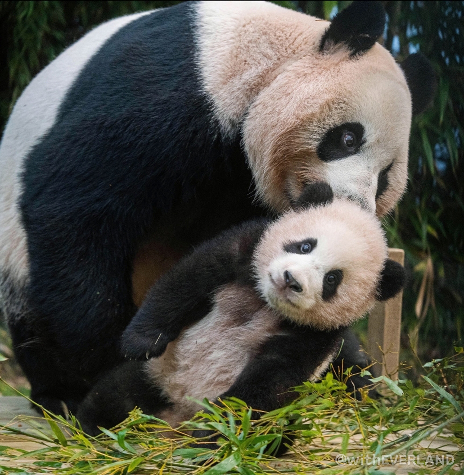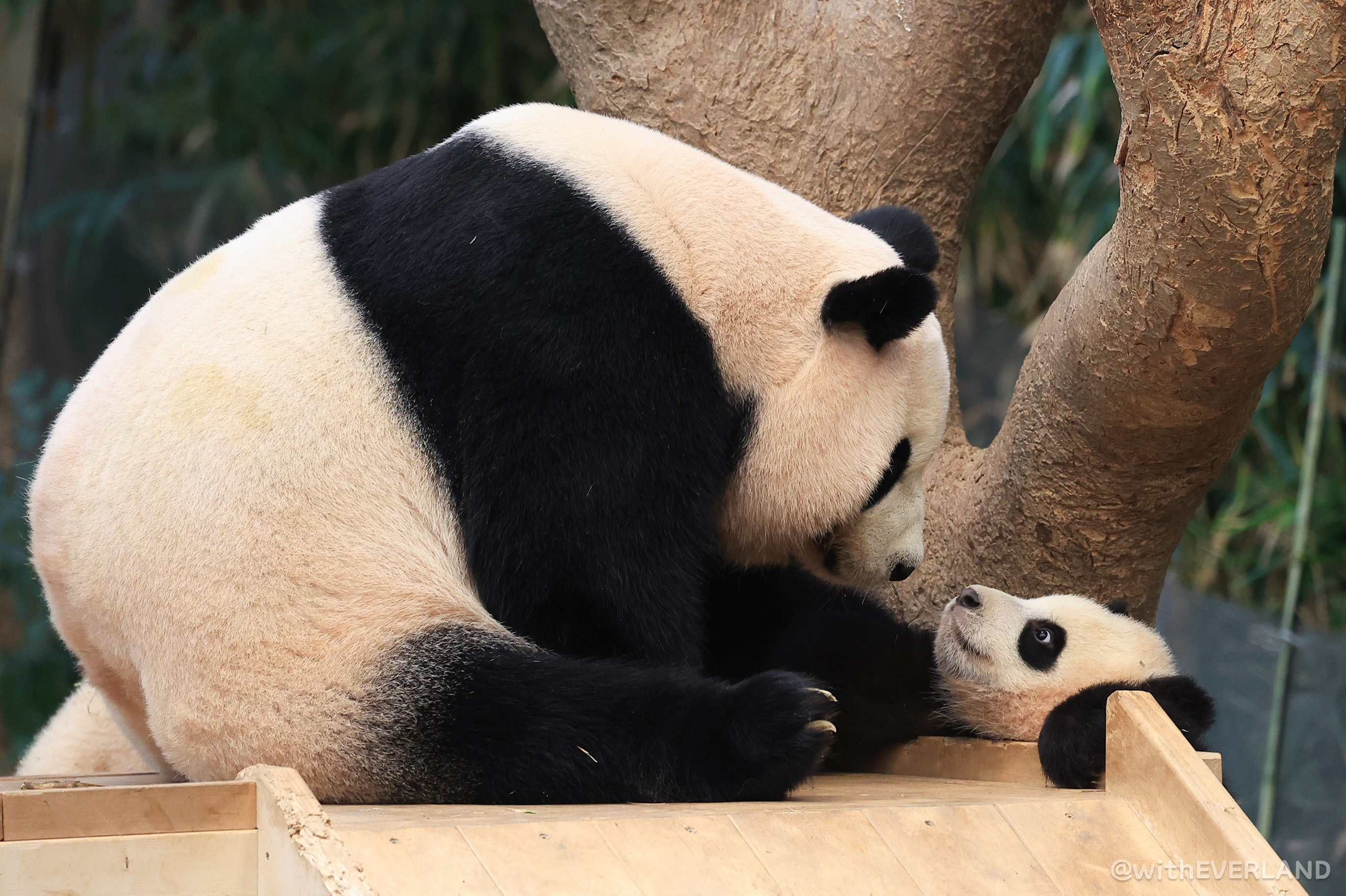 특히 엄마가 대나무를 먹거나 잠을 자야 하는 순간들에 둘이 엄마에게 매달려 놀아달라고 떼를 쓸 때,