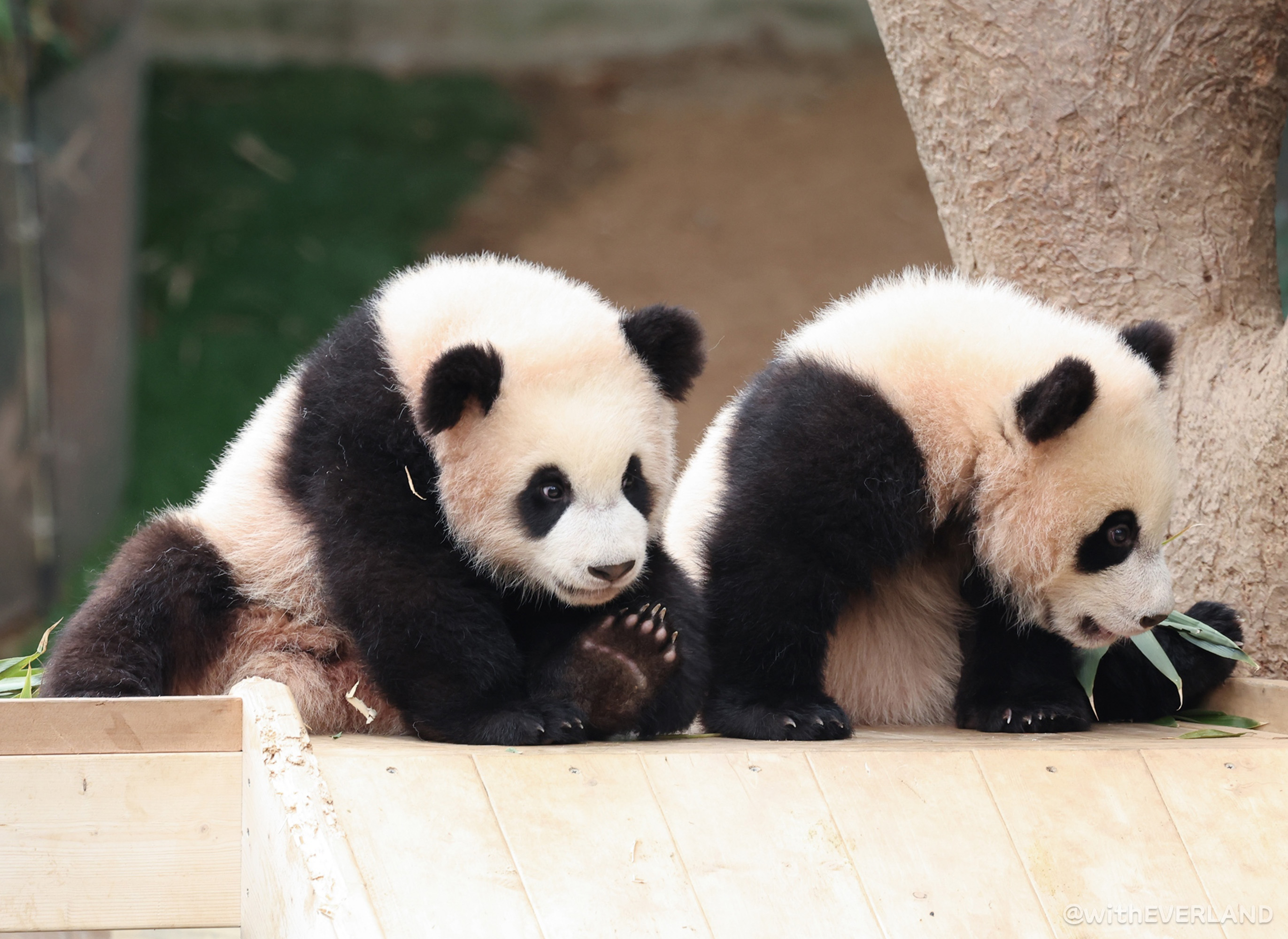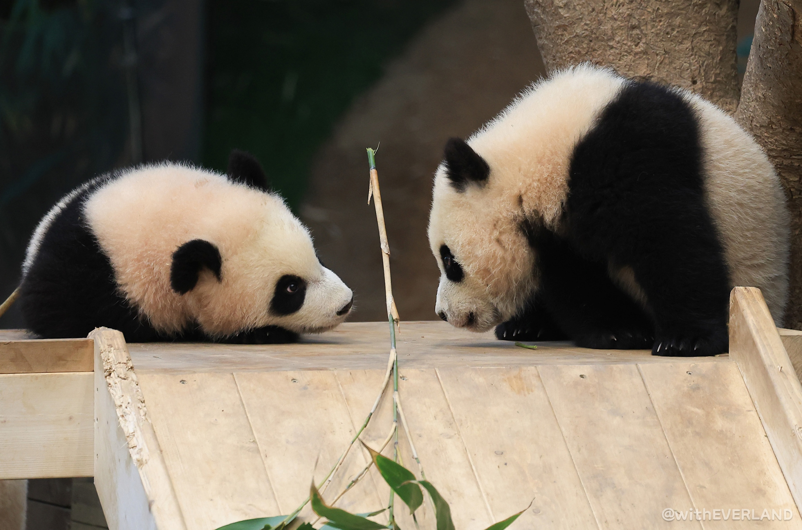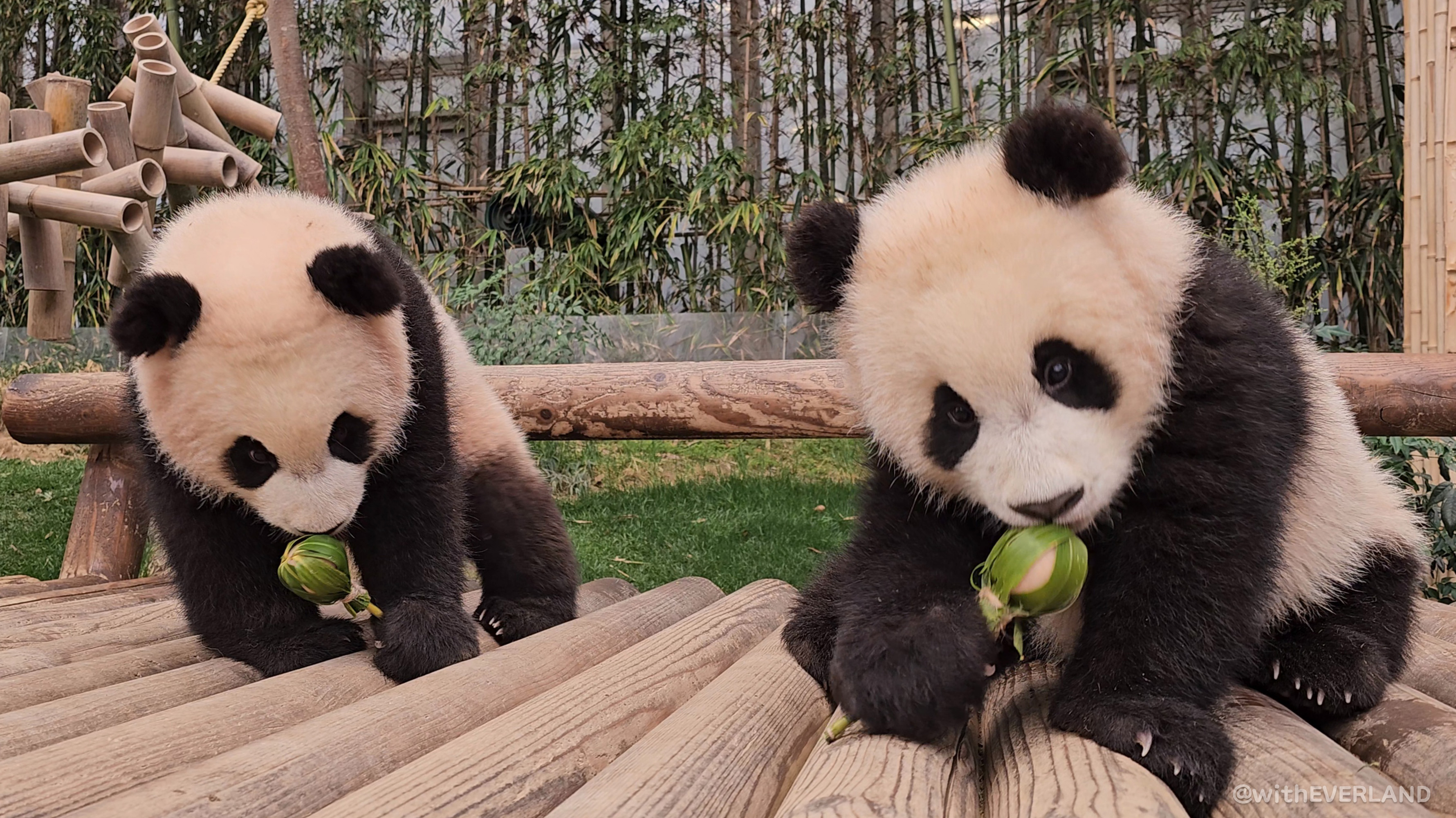 이제 곧 영구치가 나오기 시작할 쌍둥이는 대나무에 많은 관심을 보이고 있습니다.
