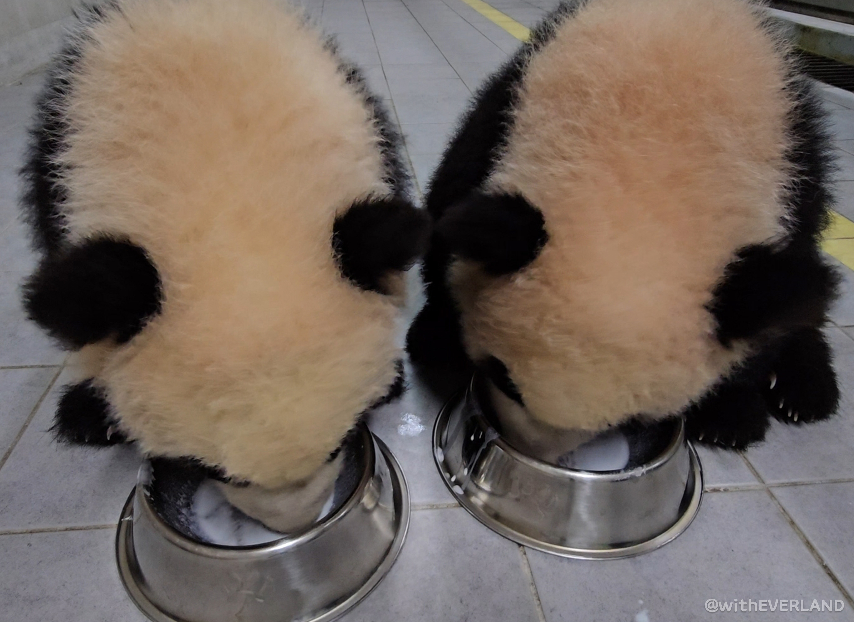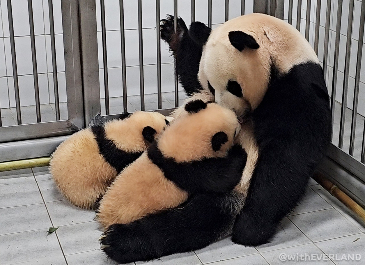 꼬질꼬질한 털뭉탱이 상태로 엄마에게 달려들어 나란히 모유를 섭취하기 시작했습니다. 이 순간 아이바오는 둘의 모유 경쟁에 관여하지 않고 공평하게 품을 활짝 열어 줍니다.