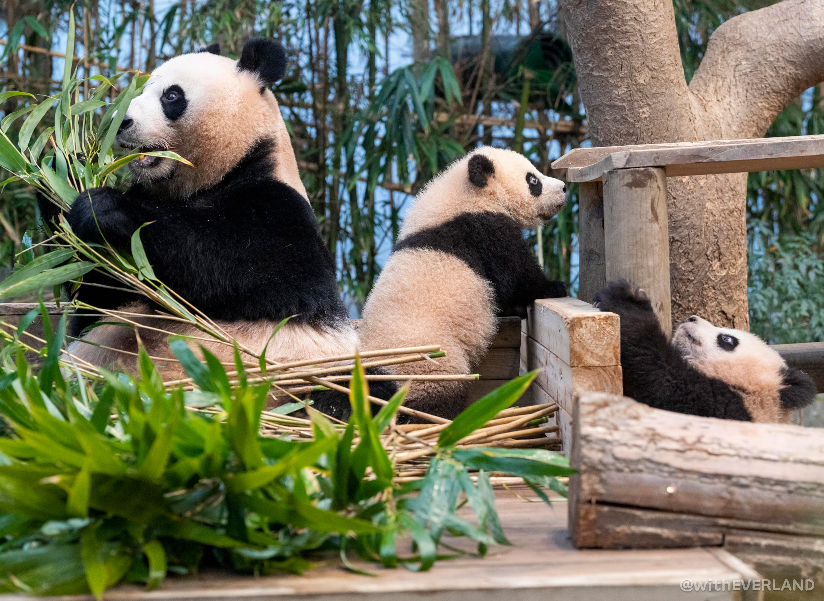 판다 할부지 강철원 사육사는 "루이바오와 후이바오가 엄마 아이바오가 대나무를 먹는 사이에 나무 쉼터에 오르거나 외나무다리도 타고 자기들끼리 장난을 치며 노는 등 판다월드 방사장에 빠르게 적응하고 있는 모습을 보이고 있다"고 밝혔다.