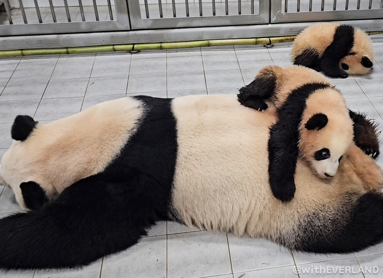 마냥 놀이 같지만 이 시간을 통해 엄마인 아이바오는 꼬맹이들에게 판다가 갖고 있어야 하는 많은 습성을 가르치는 듯해요.