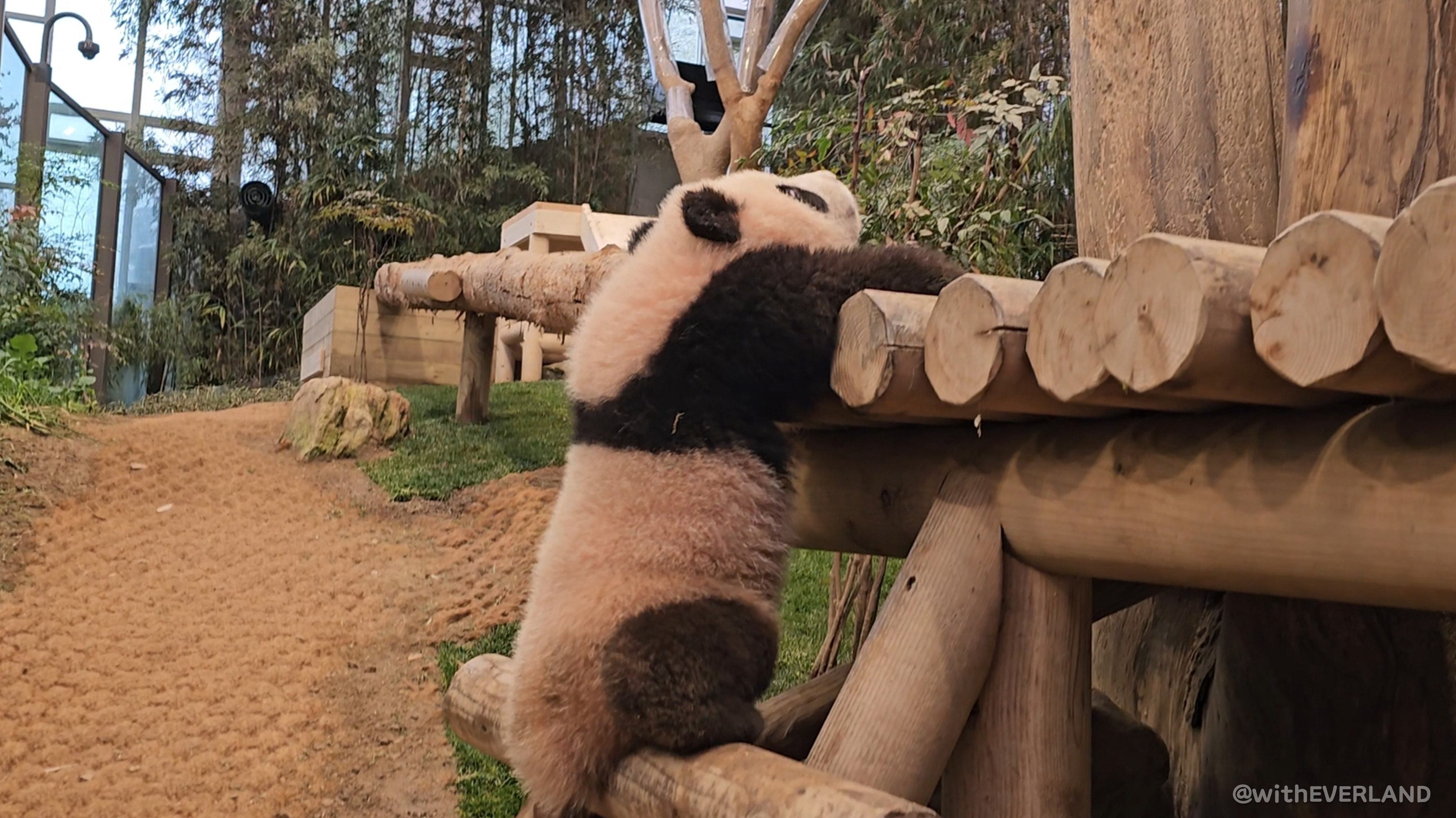 내실에 들어온 후이바오는 아직 체력이 많이 남았는지 내실의 꼭대기까지 오르는 기운이 넘치는 모습이었어요. 그러고는 혼자 내려오지 못해 당황하더라고요. 결국 제가 나서서 내려올 수 있게 도움을 주었답니다. (참 손이 많이 가는 후이에요.ㅋㅋ)