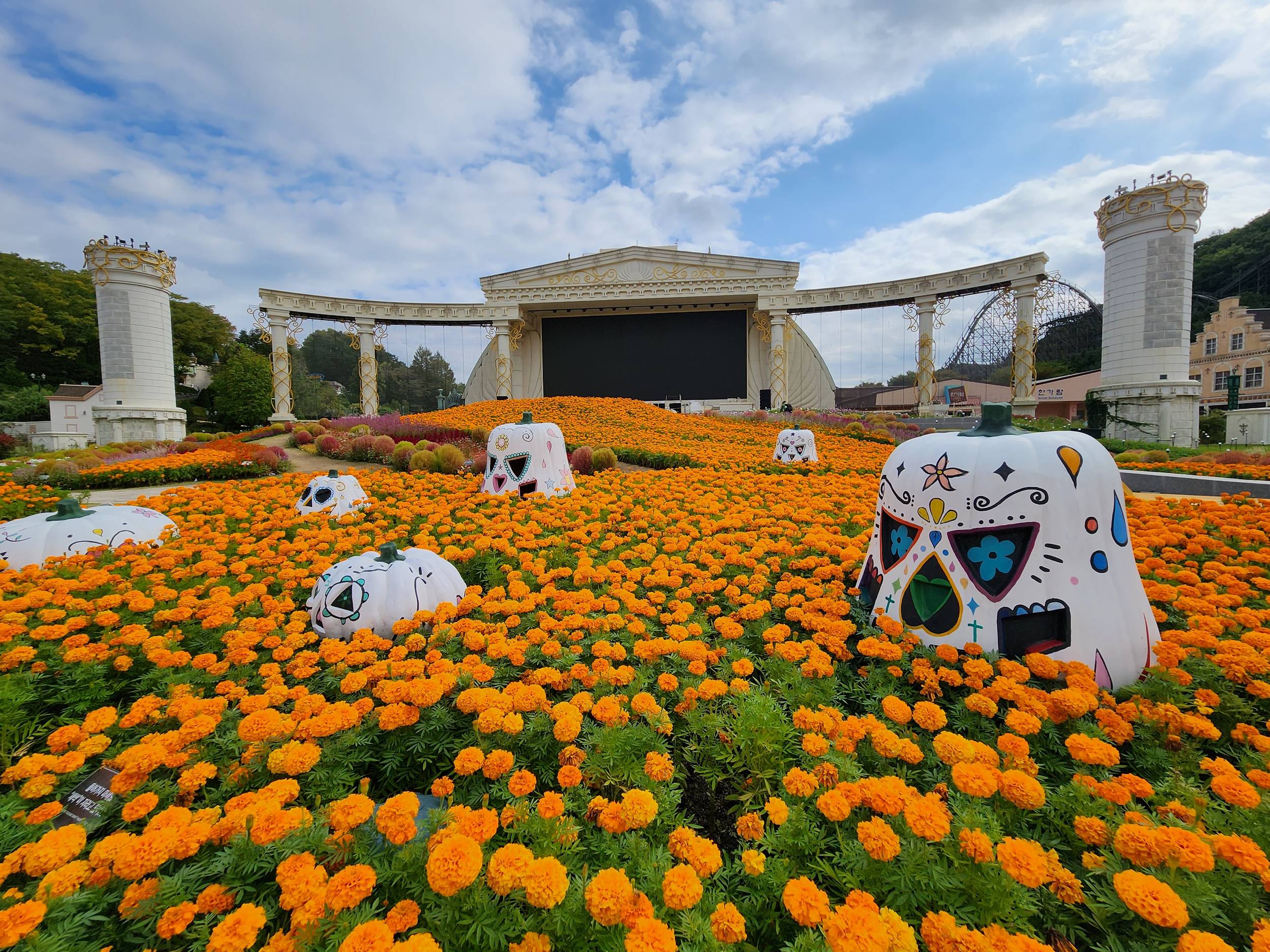 에버랜드 대표정원인 포시즌스가든을 방문하면 컬러풀한 호박 조형물들이 메리골드, 천일홍 등 가을꽃들과 함께 다채롭게 전시돼 있어 익살스러운 할로윈 추억 사진을 남길 수 있다.