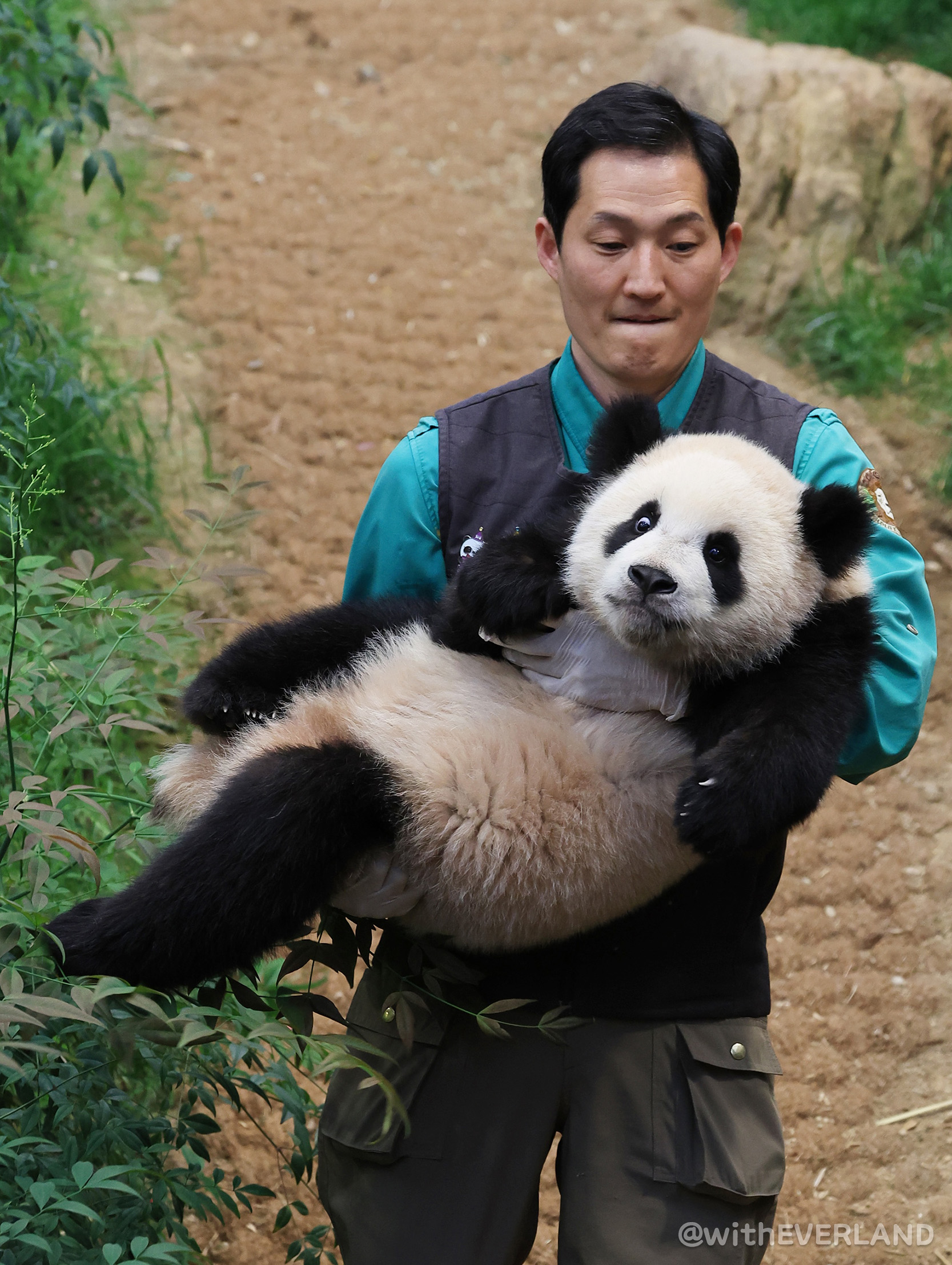 혼자였던 푸바오를 마지막까지 안아서 퇴근시키던 때 보다는 가벼운 무게지만,