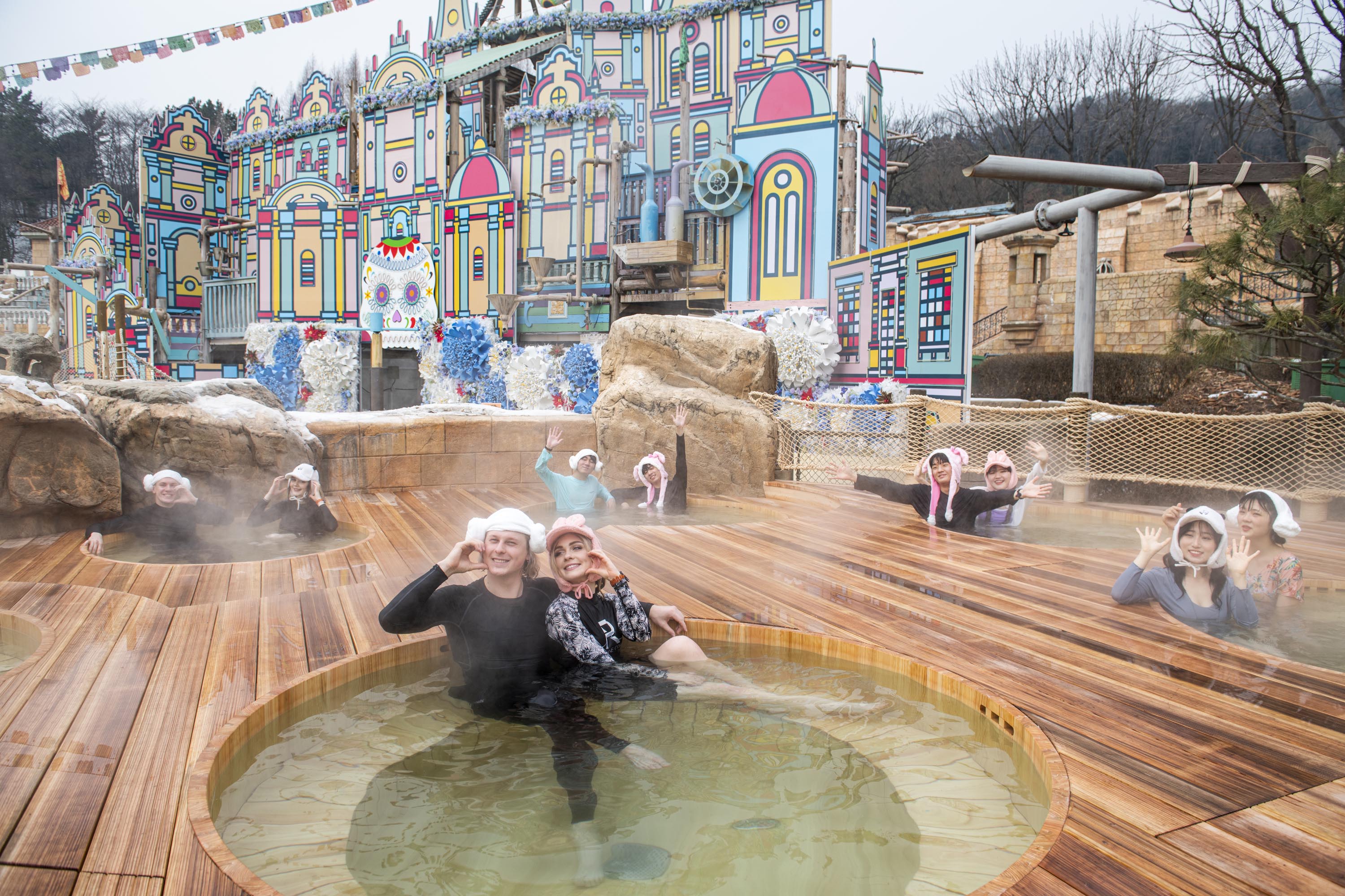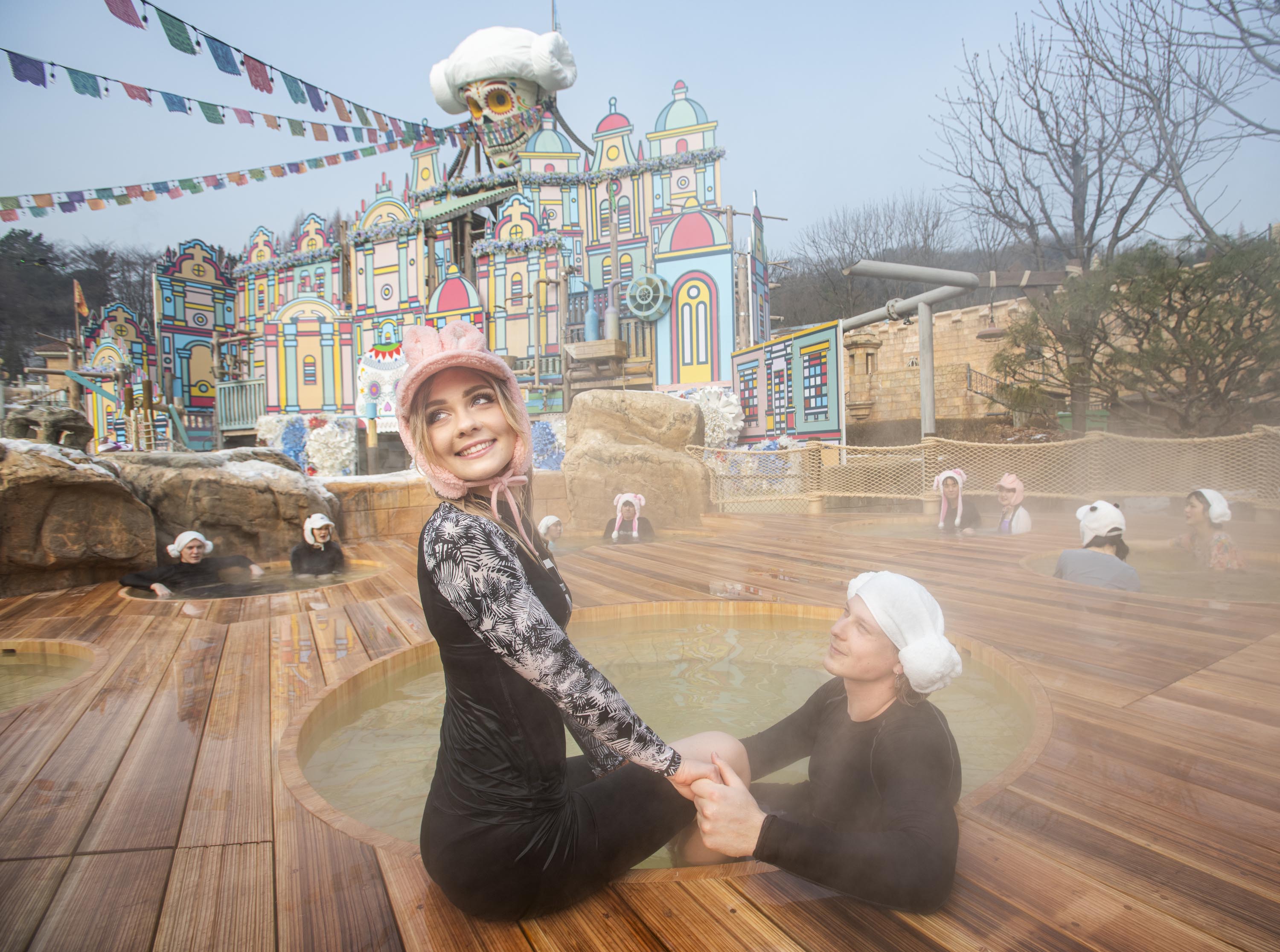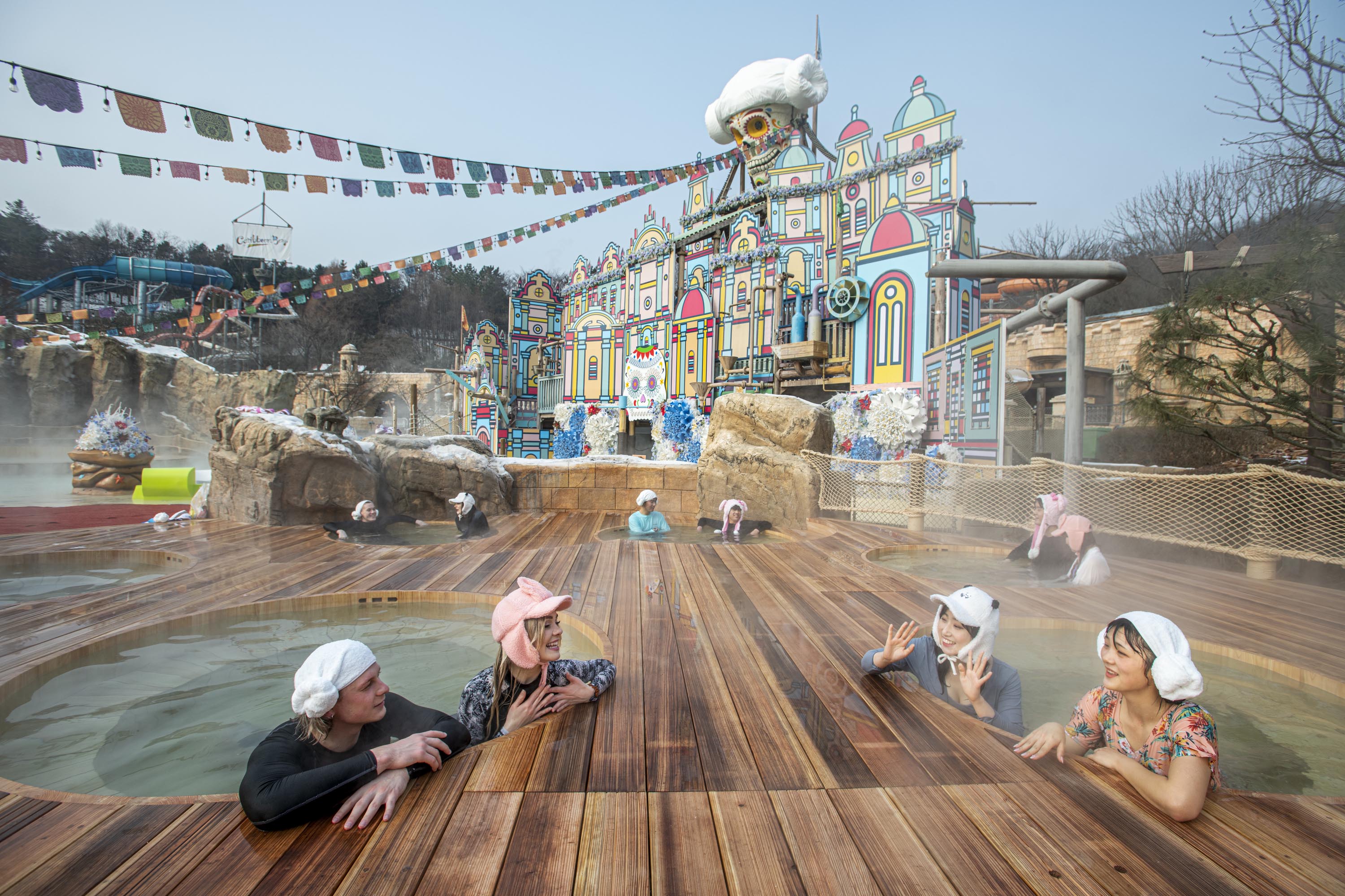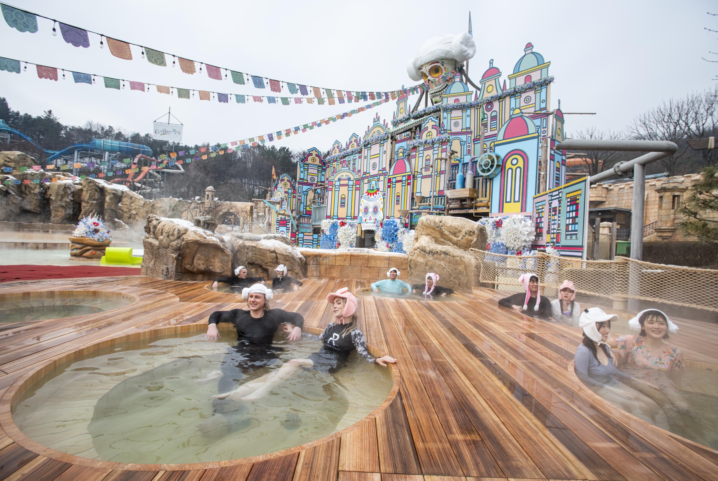 캐리비안 베이를 상징하는 거대한 해골 포토스팟 아래에서 뜨끈하게 노천 스파를 즐길 수 있는 야외 어드벤처풀 지역에는 올 겨울 편백나무(히노끼) 스파존 한 곳이 새롭게 추가 오픈했다.