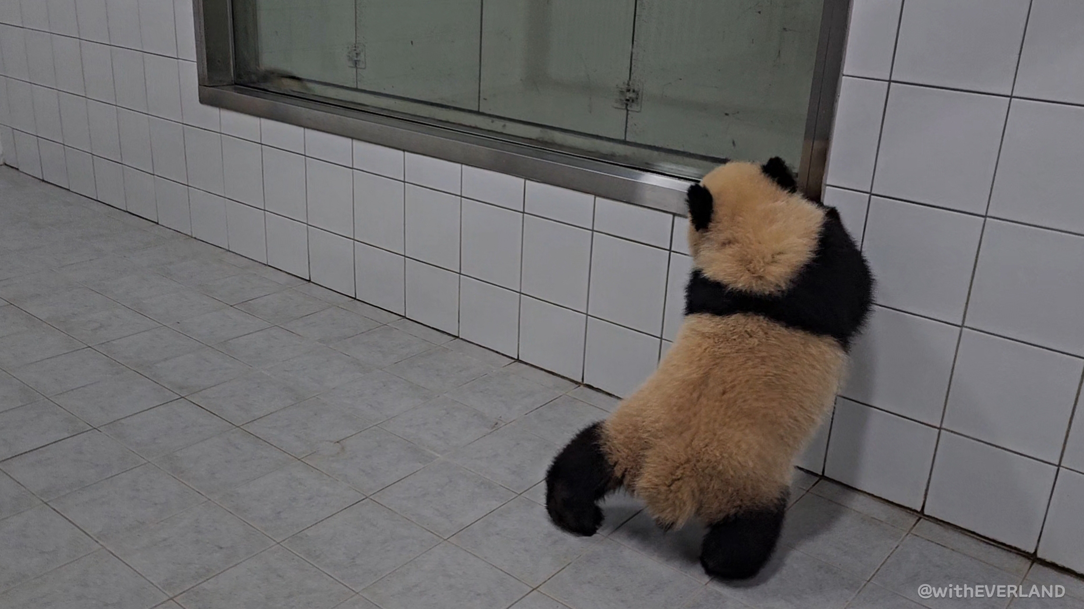 내실에 들어온 후이바오는 아직 체력이 많이 남았는지 내실의 꼭대기까지 오르는 기운이 넘치는 모습이었어요. 그러고는 혼자 내려오지 못해 당황하더라고요. 결국 제가 나서서 내려올 수 있게 도움을 주었답니다. (참 손이 많이 가는 후이에요.ㅋㅋ)