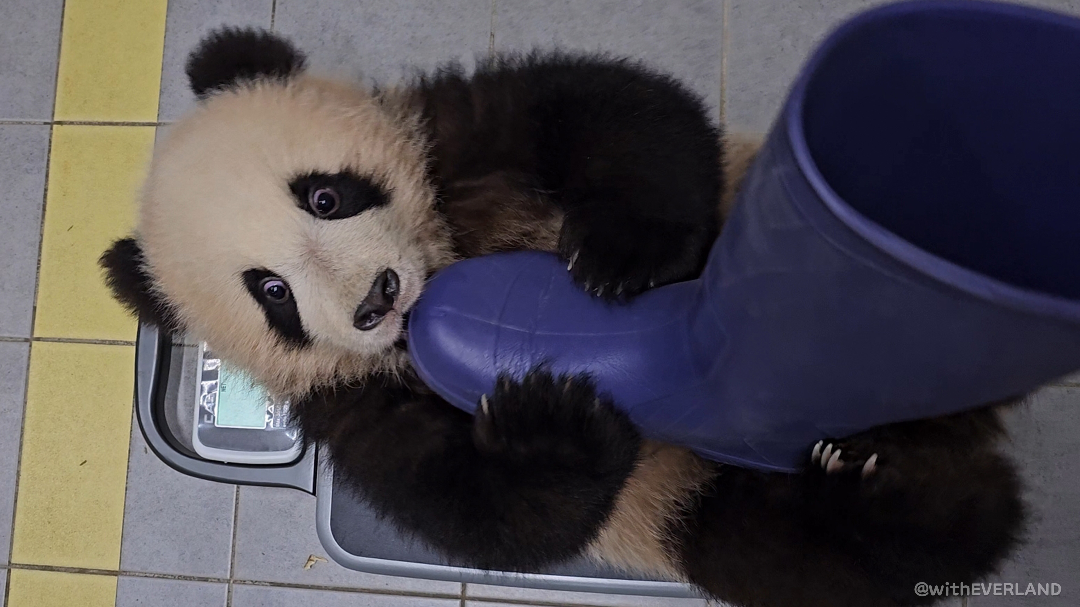 활력이 넘치는 루이와 후이의 몸무게를 재는 것은 쉽지 않습니다.