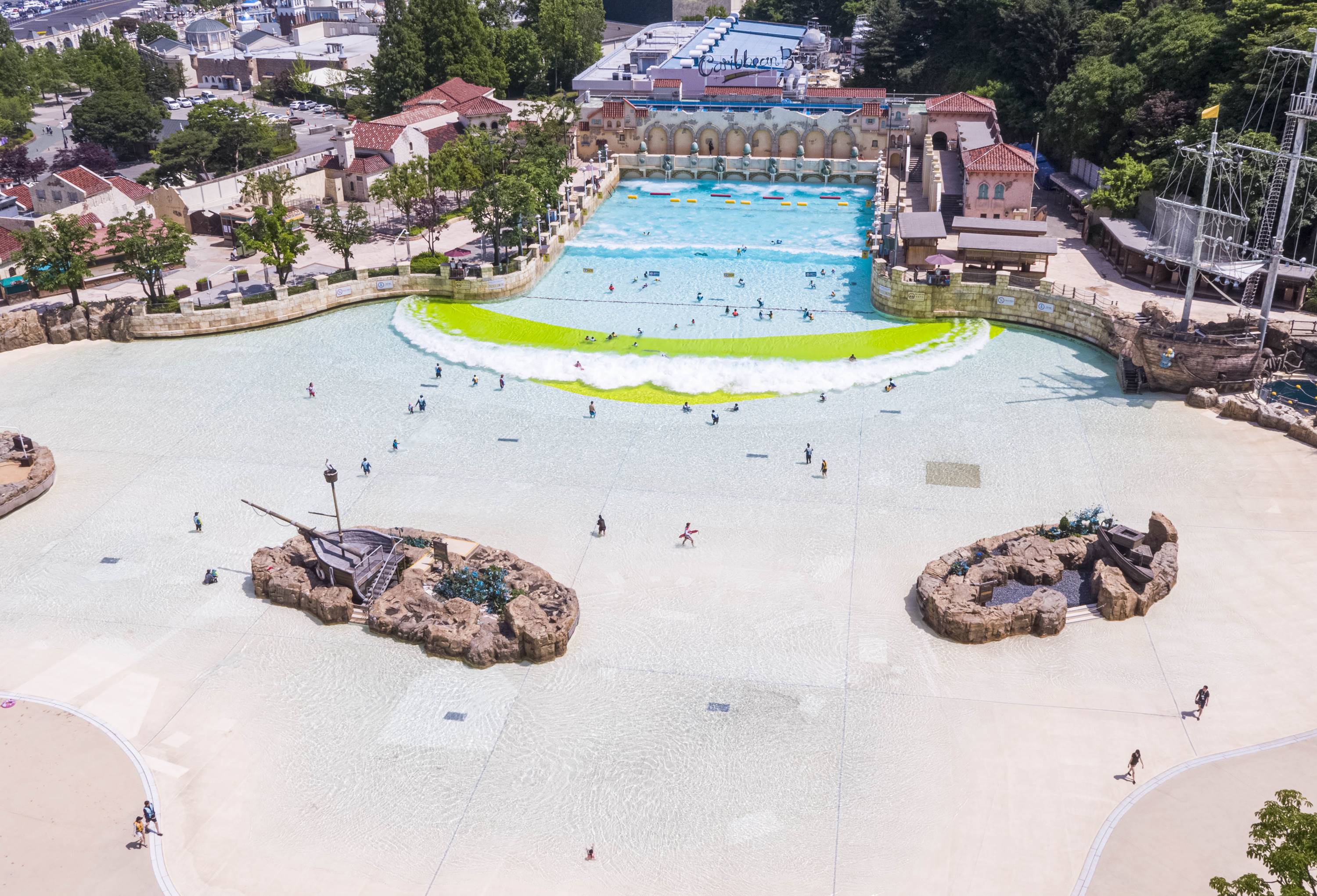 폭 120미터, 길이 104미터의 거대한 야외 파도풀에서는 이국적인 해외 휴양지 해변에 온 듯한 분위기를 만끽하며 최고 2.4미터 높이의 파도를 마음껏 즐길 수 있다.