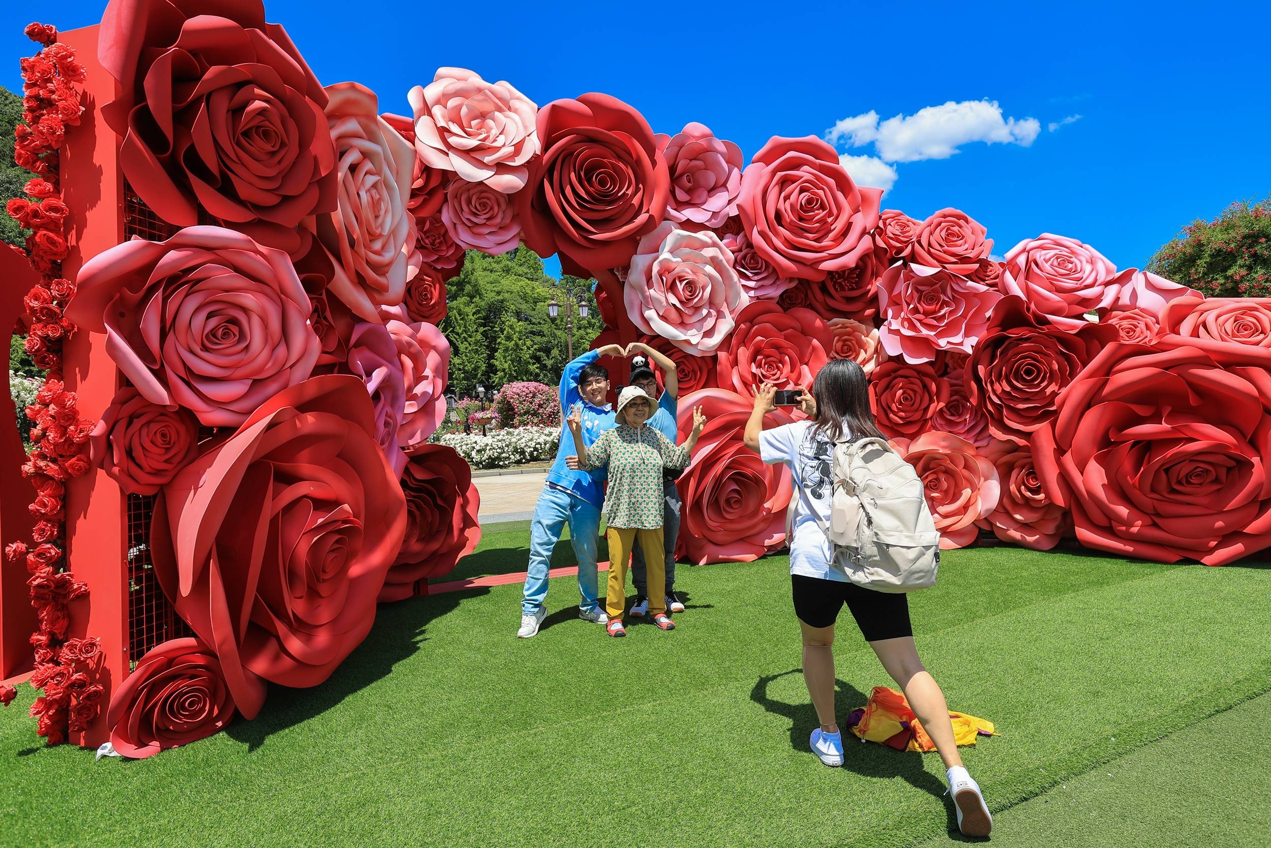화창한 봄 날씨가 이어진 4일, 에버랜드 장미축제를 찾은 시민들이 화려하게 만발한 300만 송이 장미와 기념 사진을 남기고 있다.