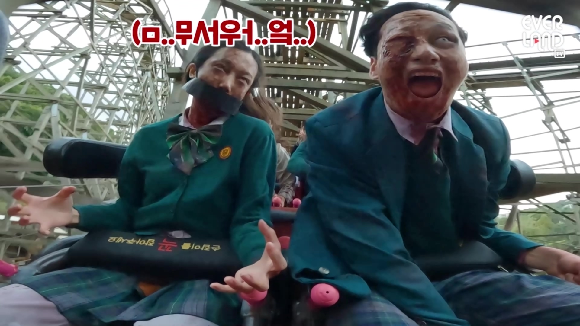 두 연기자는 해당 영상에서 최고시속 104킬로미터, 최고높이 56미터, 낙하각도 77도 등 극강의 스릴을 선사하는 것으로 유명한 티익스프레스를 좀비로서 탑승해야하는 역대급 난이도의 미션을 수행했다.