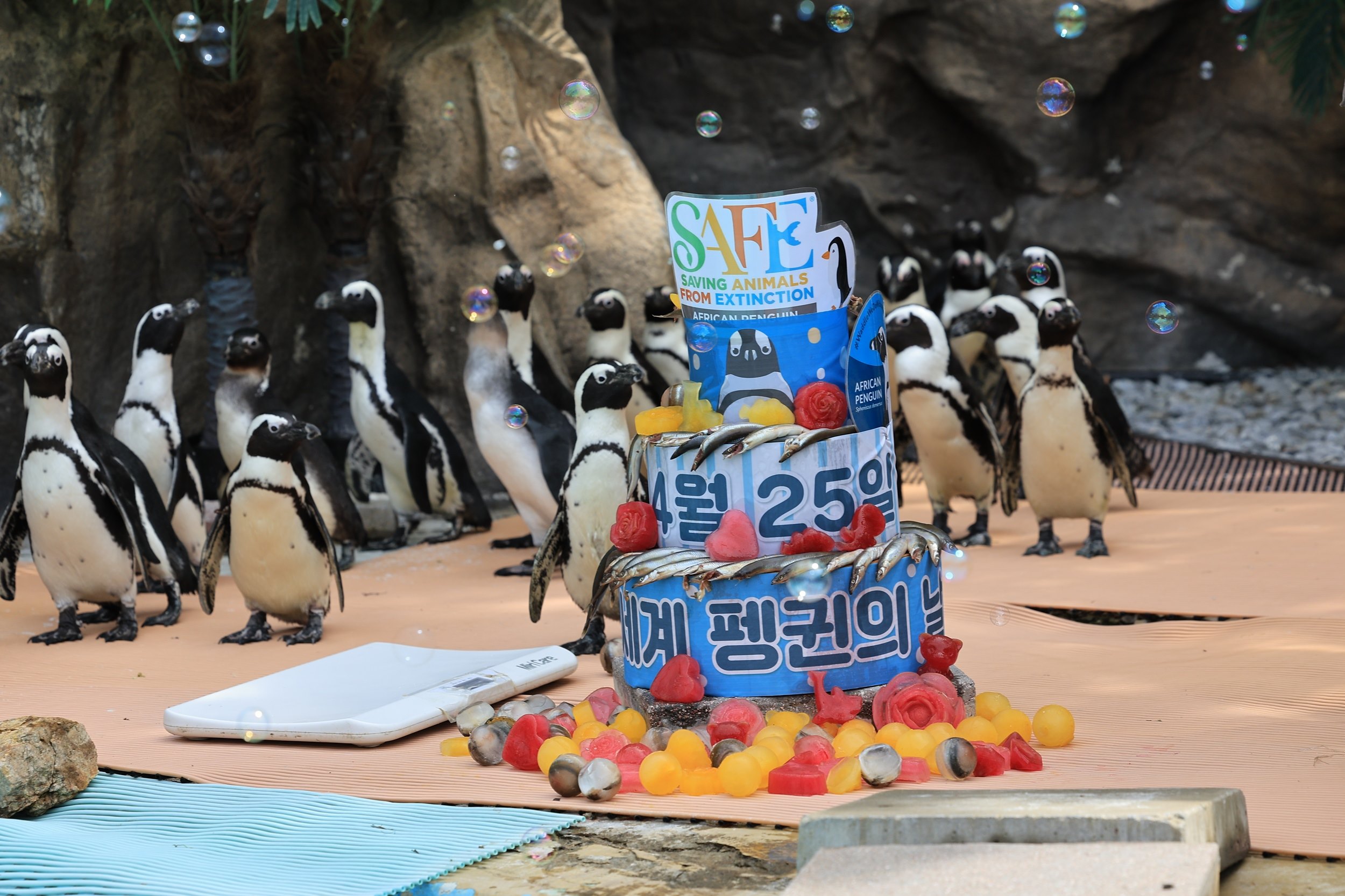 이날 에버랜드 펭귄아일랜드에서는 주키퍼(사육사)들이 양미리가 올라간 케이크 및 비눗방울 등 펭귄들이 좋아하는 인리치먼트(행동풍부화) 활동을 선물했다.