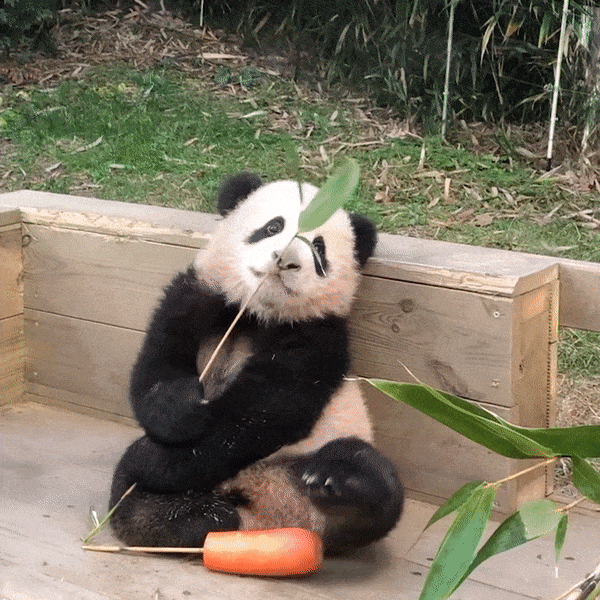 종종 마른 맹종죽 대나무의 잎을 씹어 먹기도 하고, 엄마가 대나무를 먹을 때 푸바오에게도 대나무를 주면 엄마를 따라 오랫동안 씹고 있는 모습을 볼 수 있지요.
