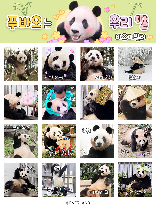 이번에 출시한 '푸바오는 우리 딸' 카카오 이모티콘은 눈벼락 맞는 푸바오, 춤추는 러바오, 심쿵 표정의 아이바오 등 에버랜드 공식 유튜브와 말하는동물원 뿌빠TV 유튜브 인기 영상 중 팬들에게 많은 사랑을 받았던 판다 가족의 재미있는 모습들을 이모티콘 24종에 담고 있다.