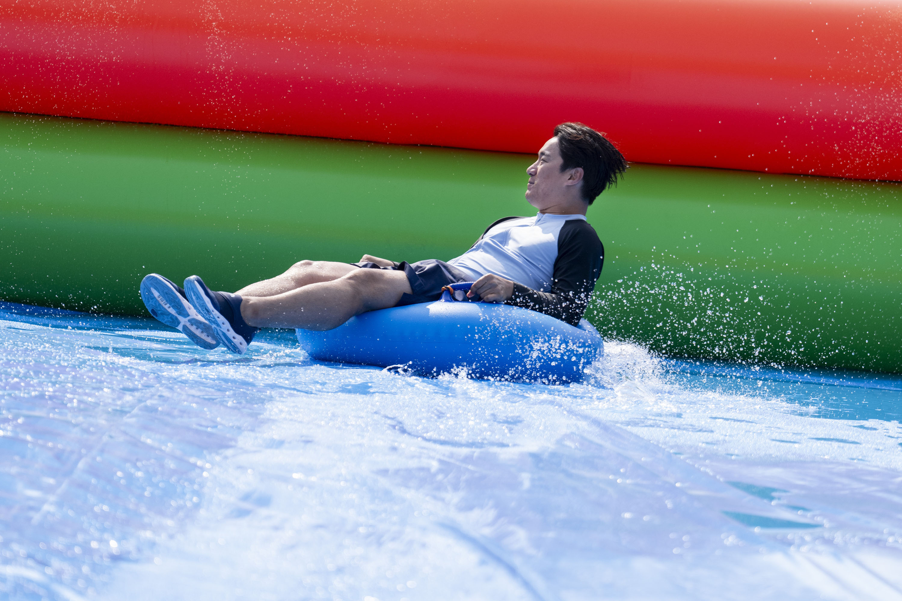 이중 스플래쉬 슬라이드(6개 레인)는 에어바운스 형태의 초대형 튜브 슬라이드로, 물이 흘러내려 가는 약 6미터 높이 시작점에서 튜브에 앉아 출발하면 45도 각도로 급하강 후 110미터 길이의 슬로프를 따라 시원하게 질주하며 짜릿한 쾌감을 맛볼 수 있다.